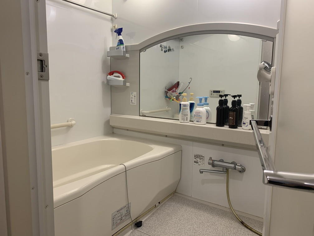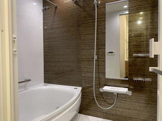 ゆったりとしたワイド浴槽、メタル調で統一されたシャワー、収納棚、正面のアクセントパネルが高級な雰囲気のユニットバスに。 ユニットバス交換にあわせて、洗面所の壁クロス、床CFもリフォーム。明るいCFを選ばれ、お部屋が一層明るくなりました。