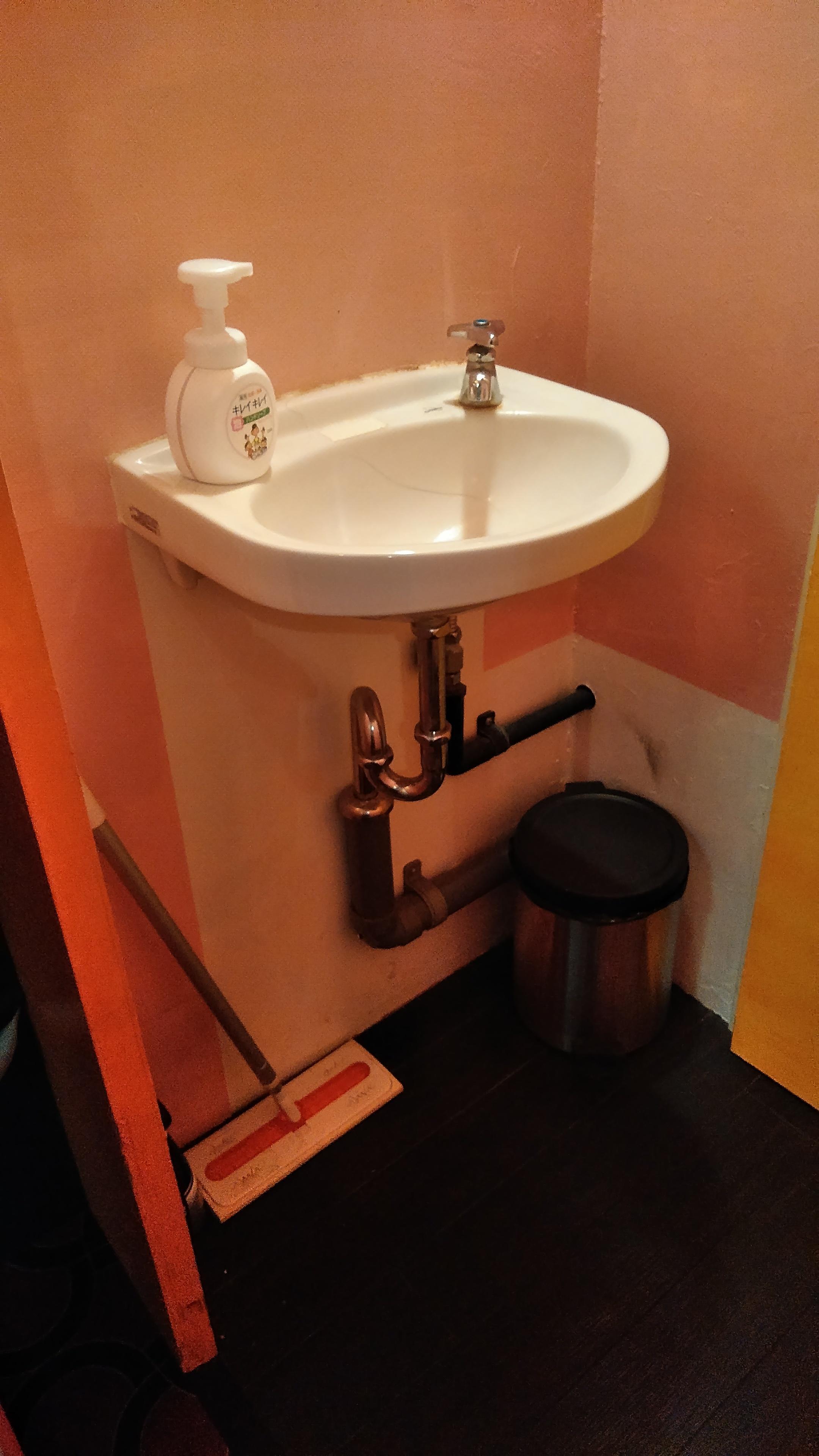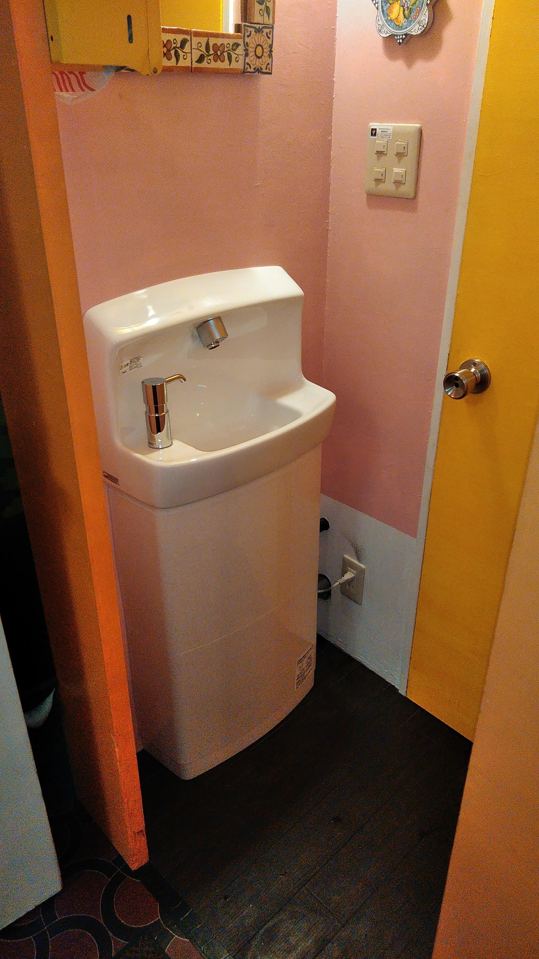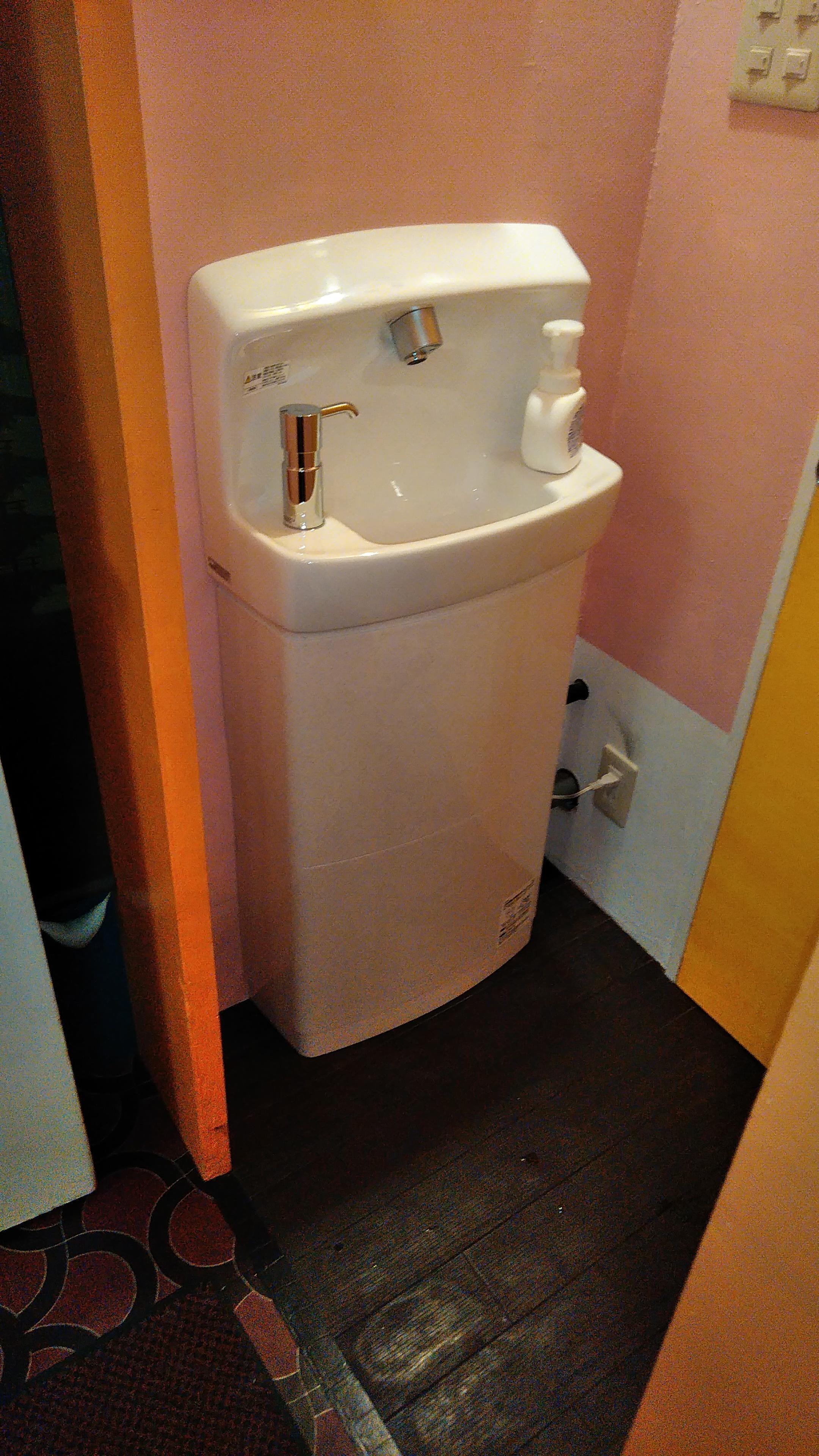 江東区富岡にあります、ワインバー 『グスターレ』 新型コロナの為に手洗器を自動水栓の手洗器に交換いたしました。スマートな形状にお施主様も満足していただけました。足元に電源確保の為、コンセントを設置致しました。