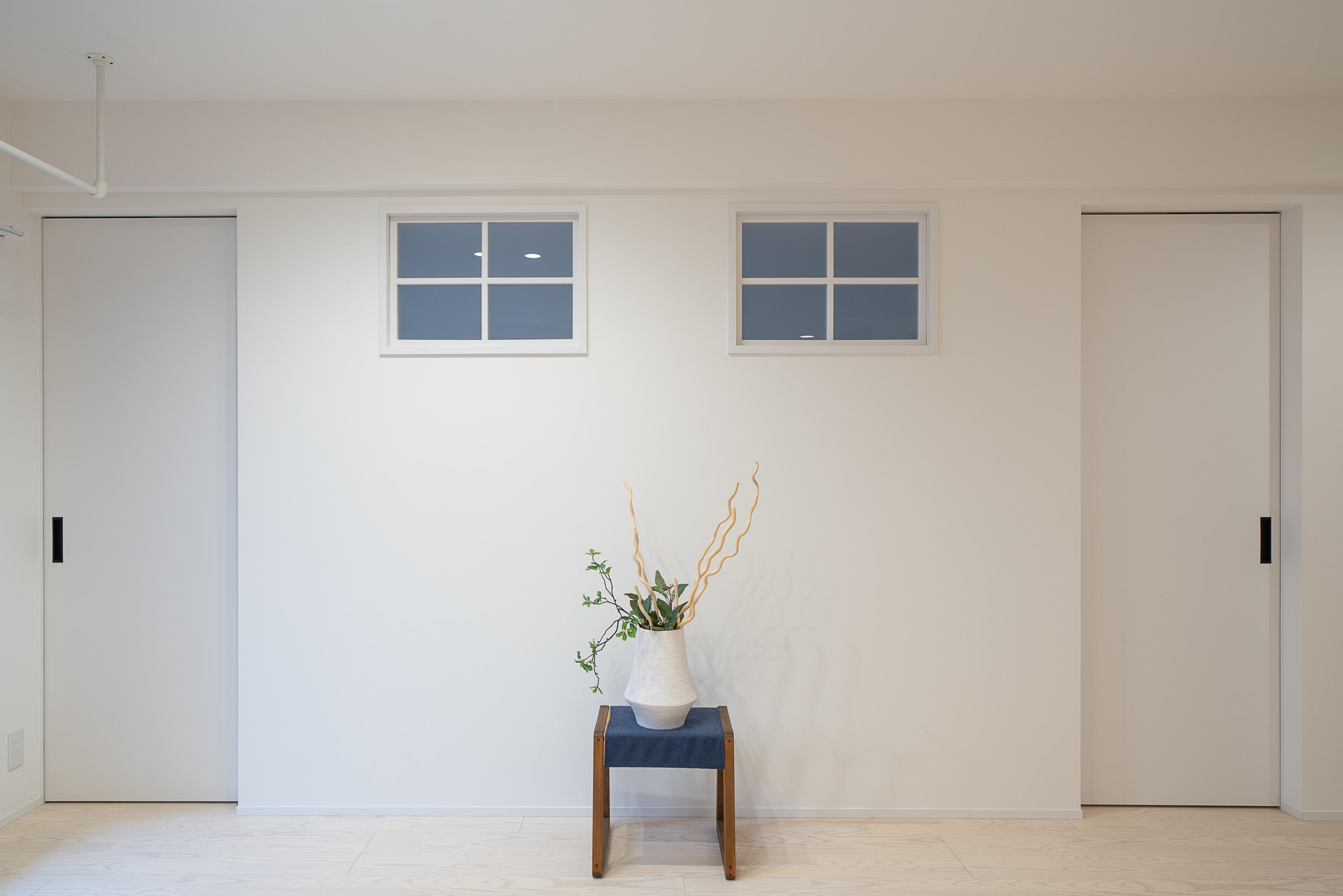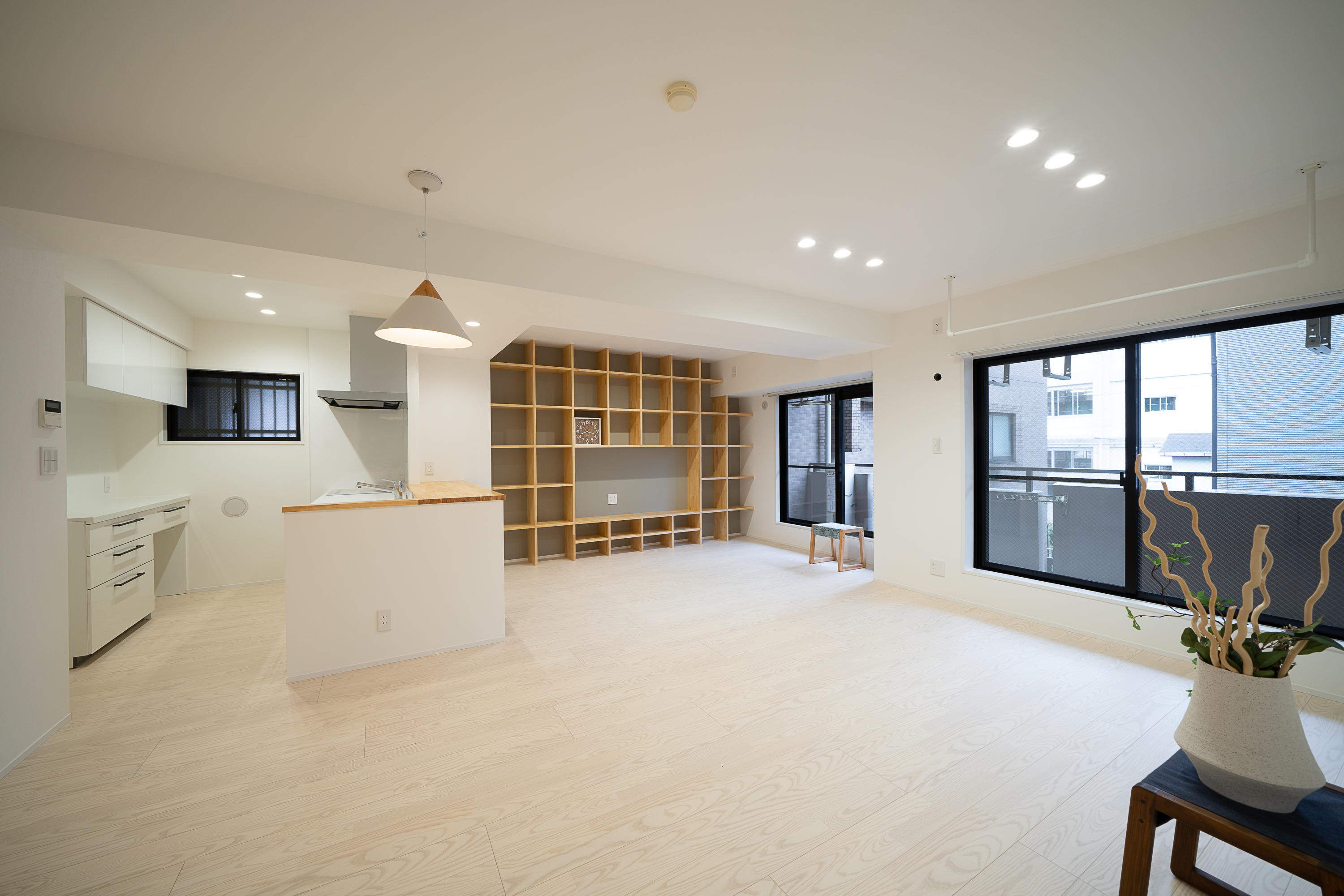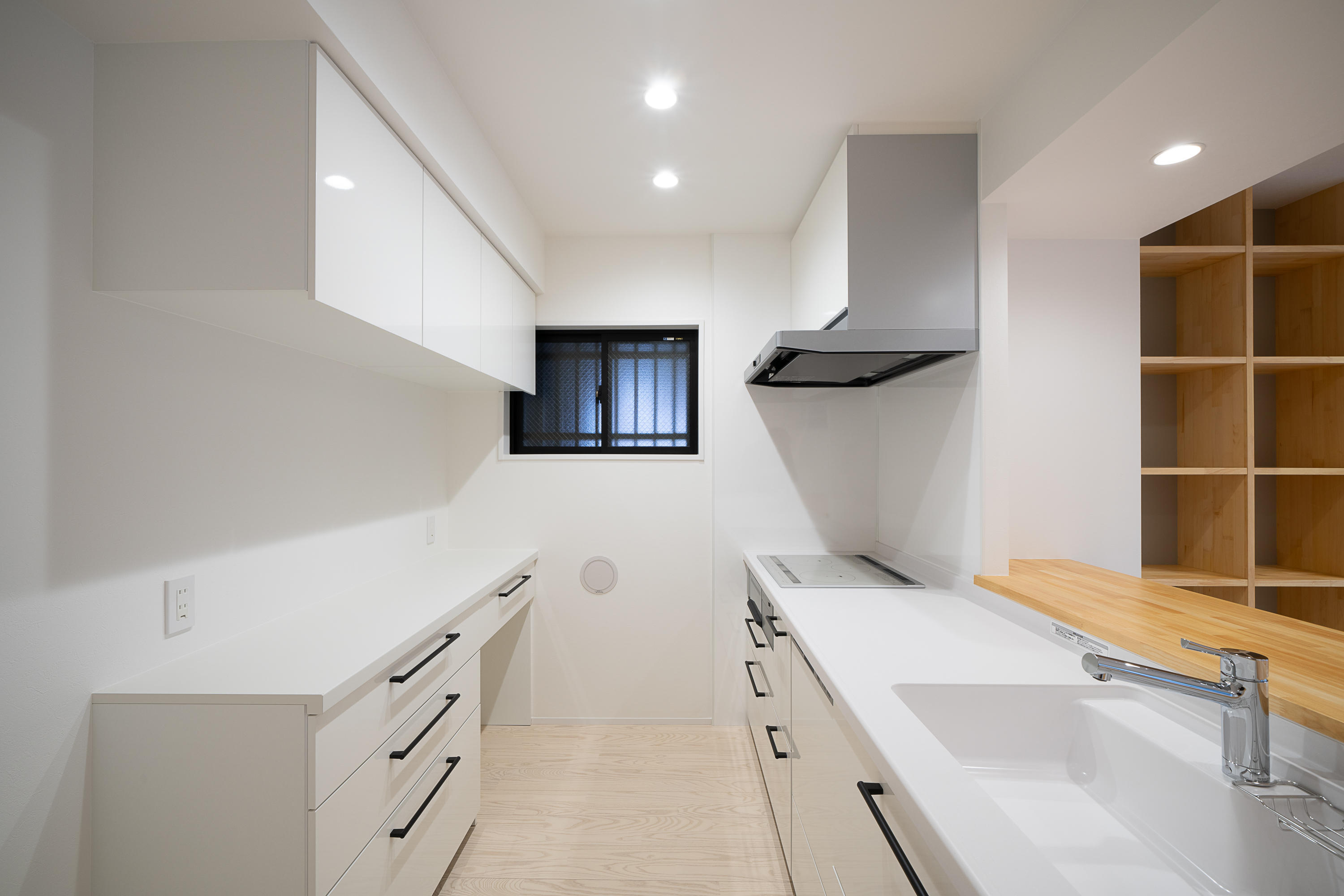 壁付けの棚を埋め込み型にしたり、巾木等を白で統一することで広々とした印象になっております。