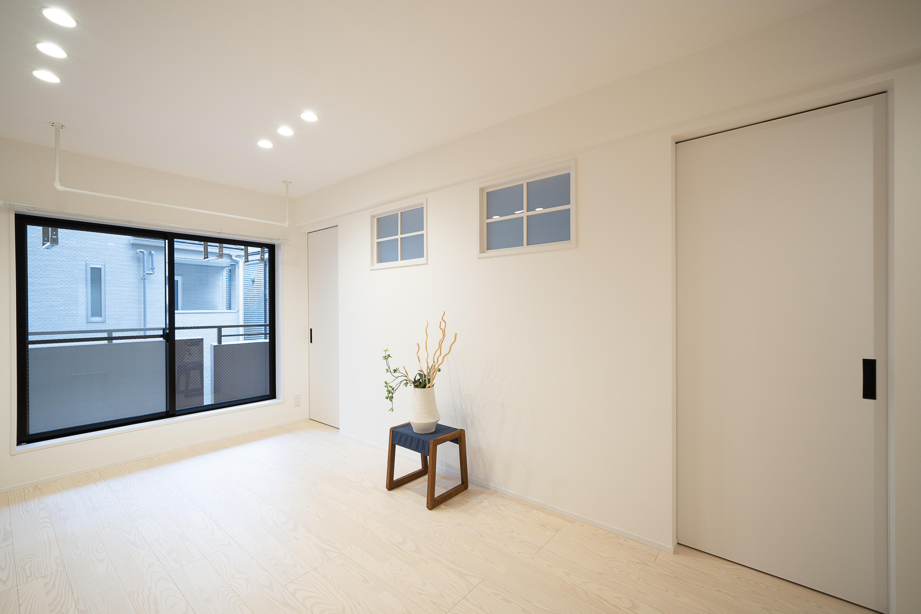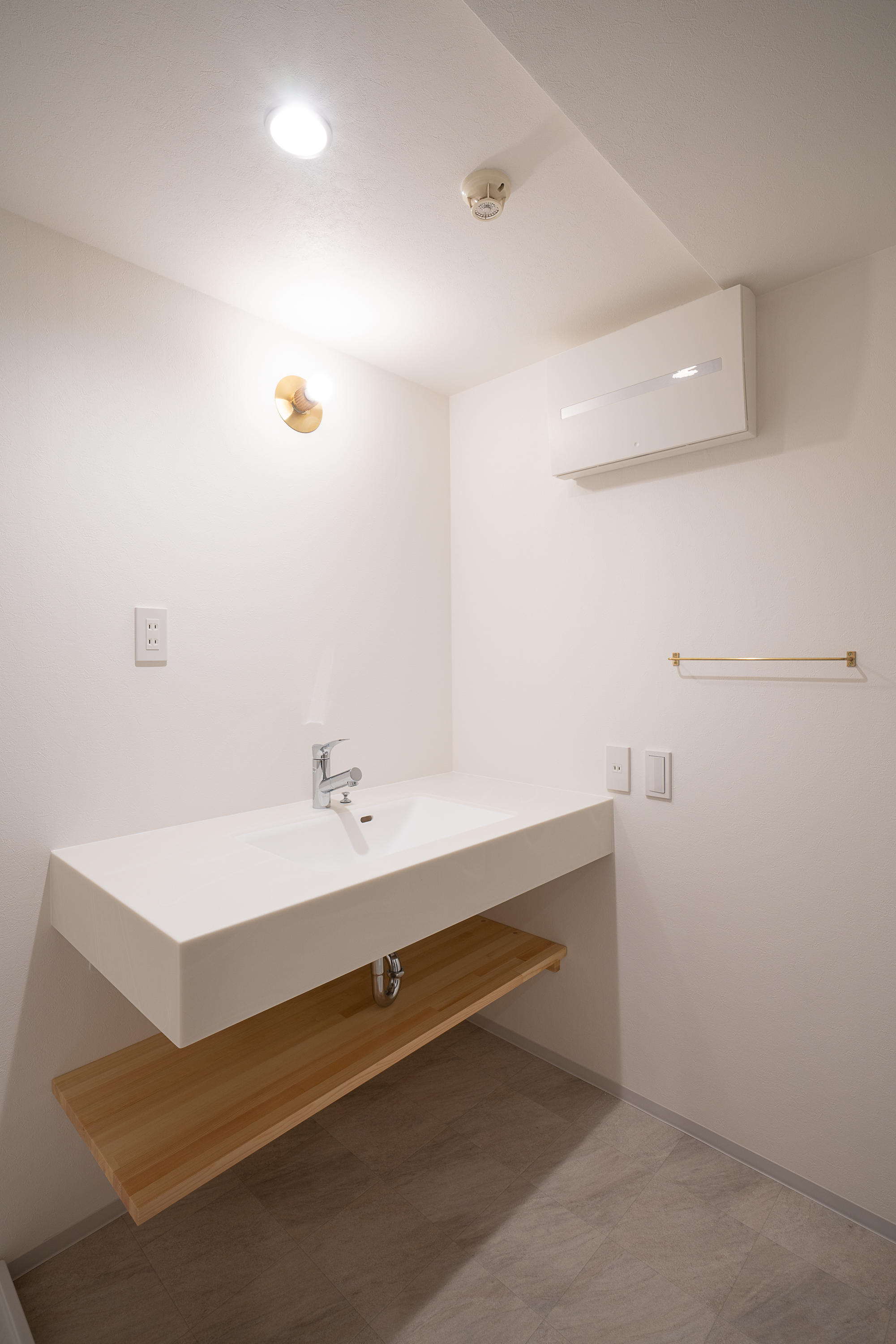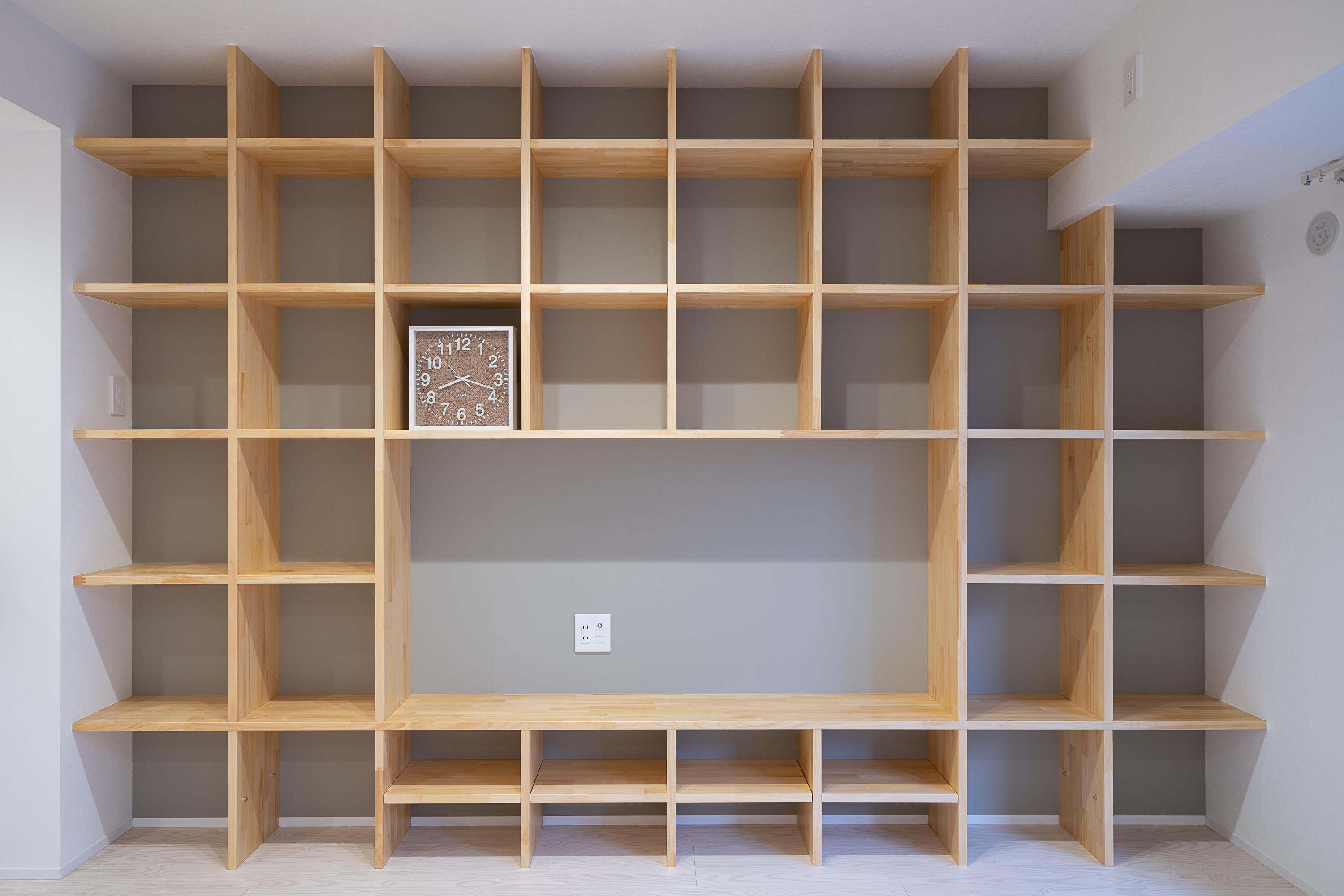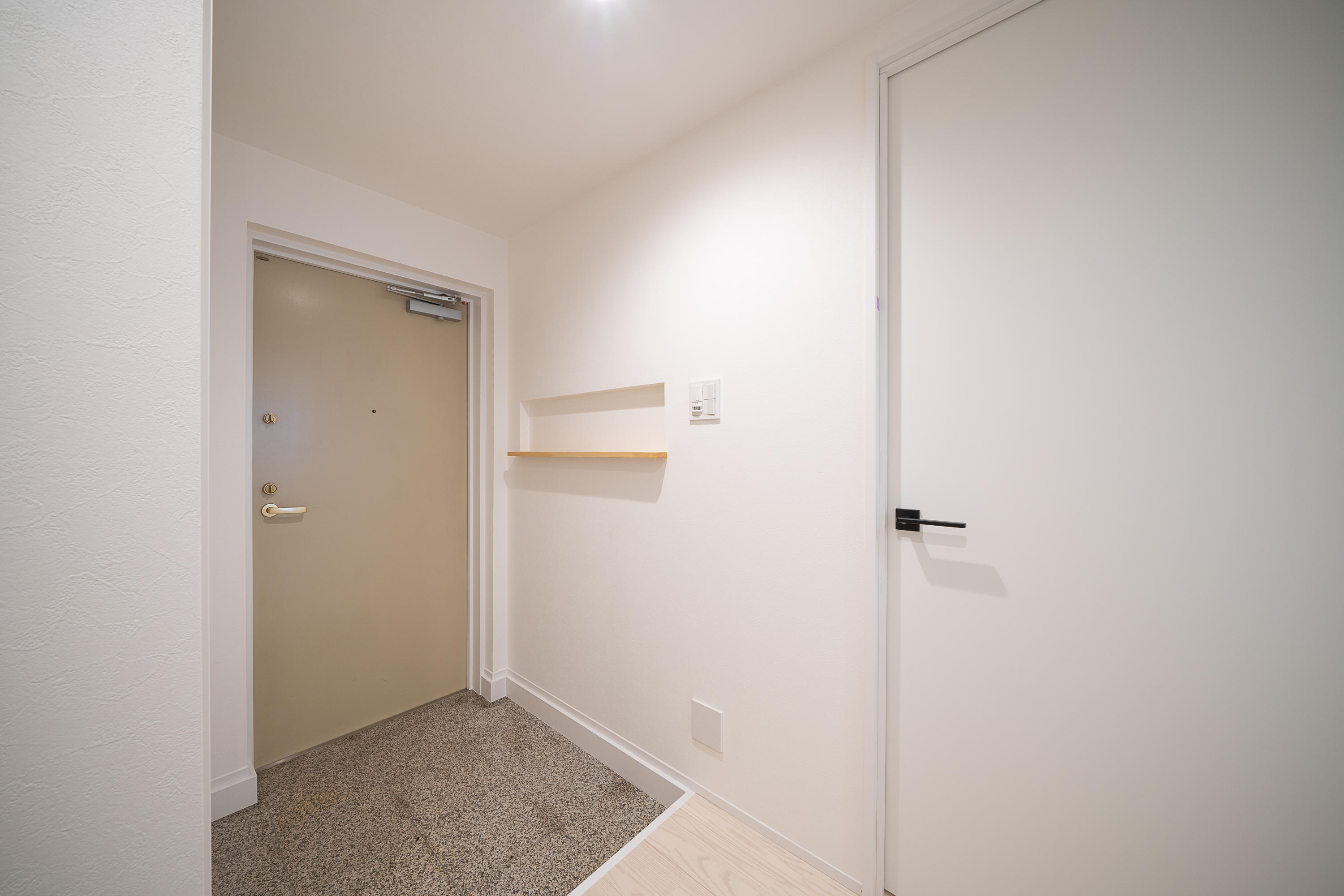 壁付けの棚を埋め込み型にしたり、巾木等を白で統一することで広々とした印象になっております。