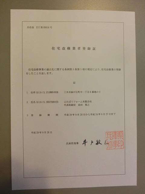 このたびふたばリフォームは兵庫県住宅改修業者登録制度に則り、