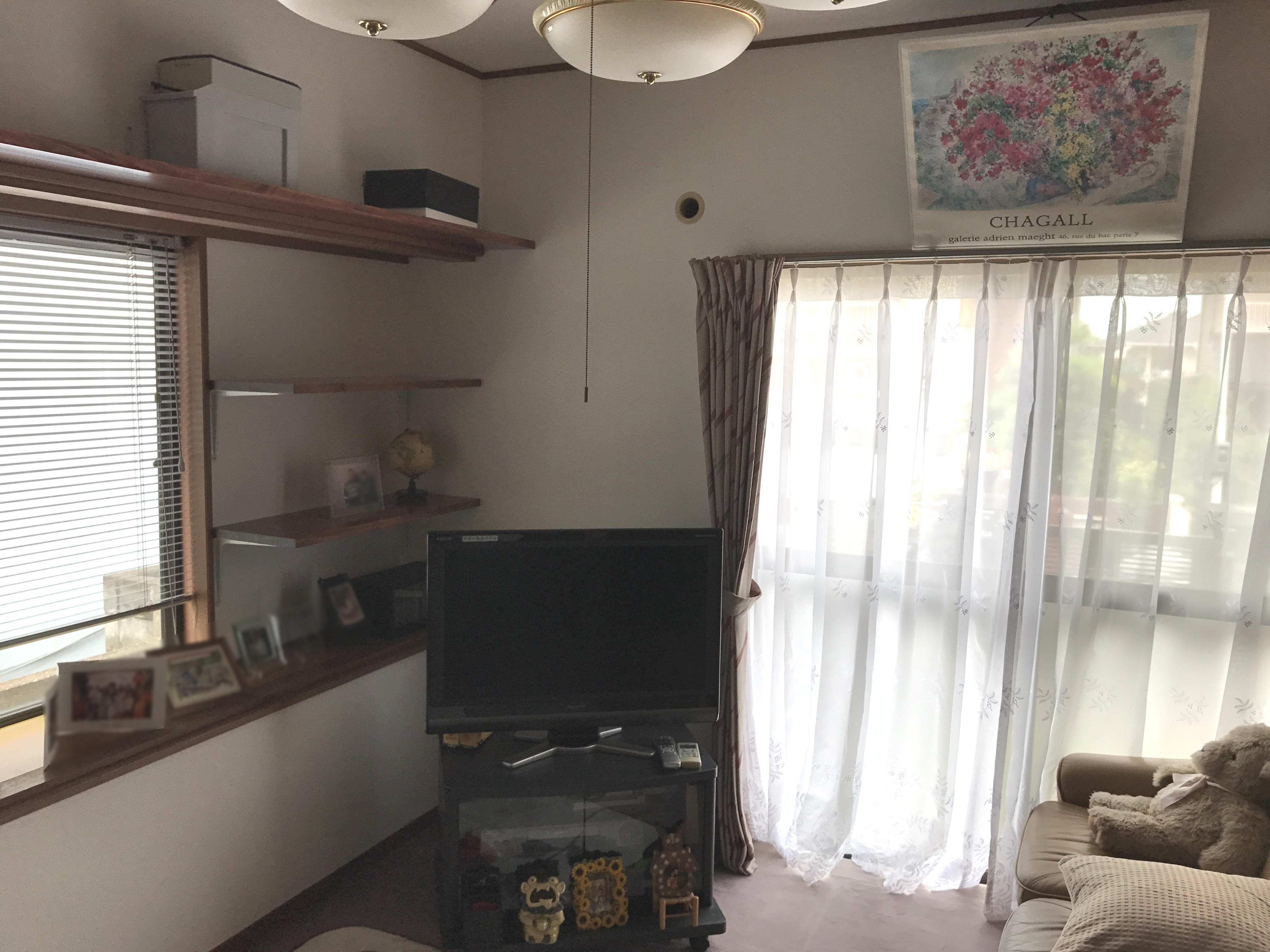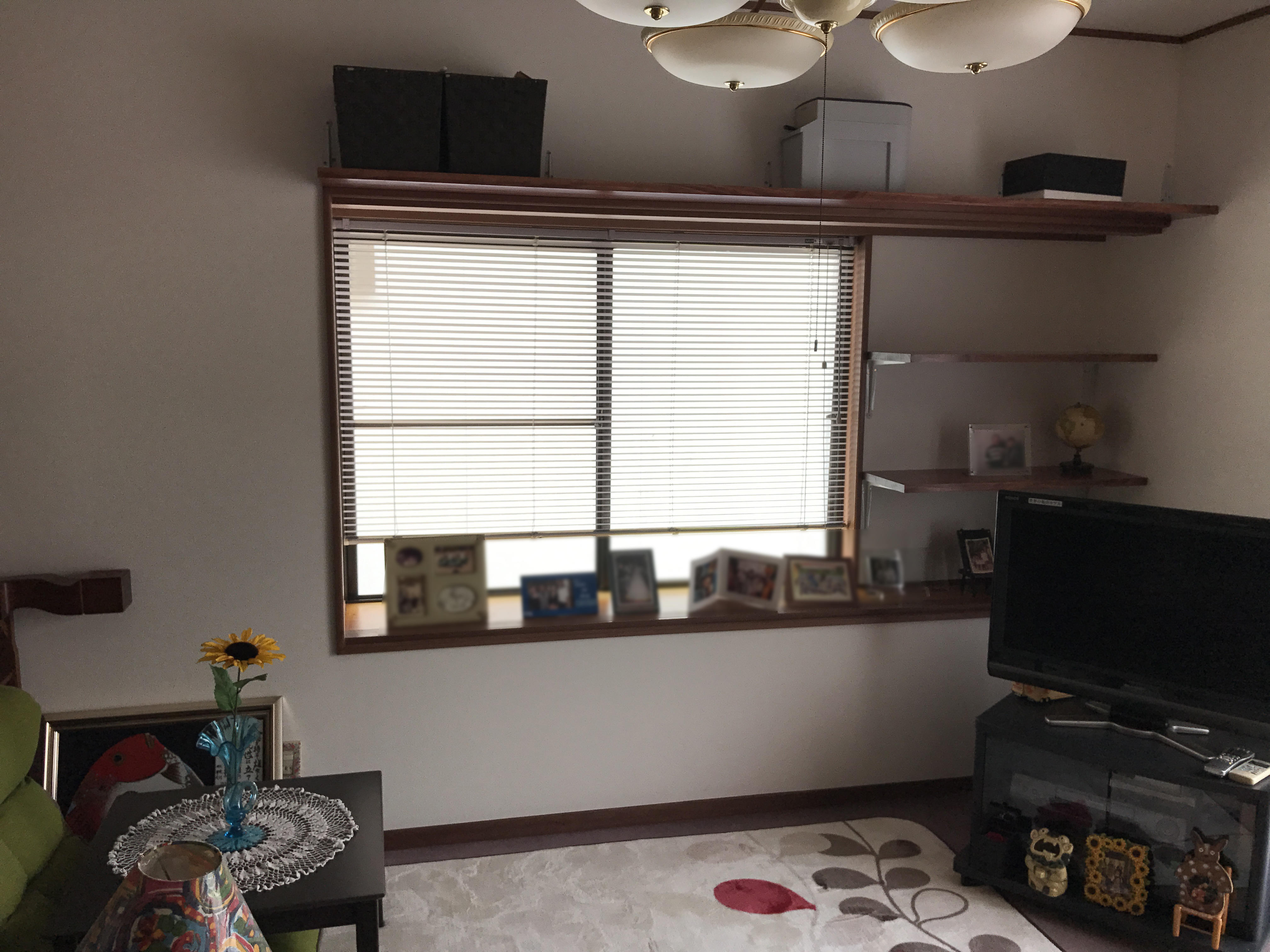 出窓の棚に写真を置かれていましたが、壁紙の老朽化や物の増加に伴って、クロス交換・棚の取り付けを依頼いただきました。