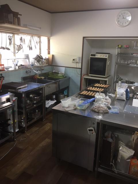 床には丈夫なフロアタイルを使用し、客間と一続きにすることで、楽な動線を確保しています。こちらの厨房機器のほとんどは施主様があるお店から譲り受けたもので、工事の低コスト化に成功しています。卓上には作りかけの食材が並んでいます、どんなお料理が出てくるんでしょうね?