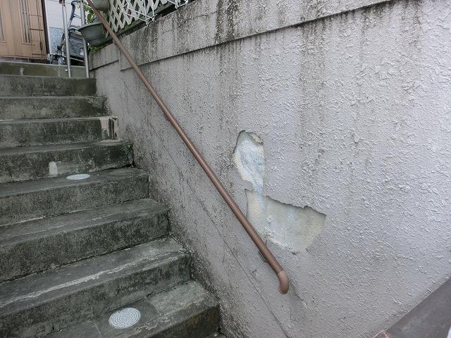 門の周辺は大部分が劣化し、下地のモルタルまでぼろぼろになっていました。下地の補修から始め、再度同系色で塗装することで、元通りになりました。