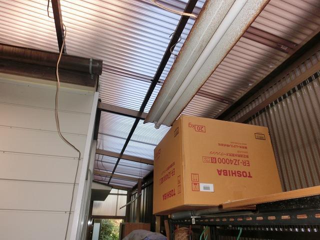 こちらも長年風雨から守ってきた波板でしたが、紫外線を受け続けた結果、茶色く変色しいつ壊れるかという状況でした。新しいポリカーボネート製波板に交換した結果、変色により遮られていた日光がまたストックヤードに入り、明るく綺麗に復活しました!