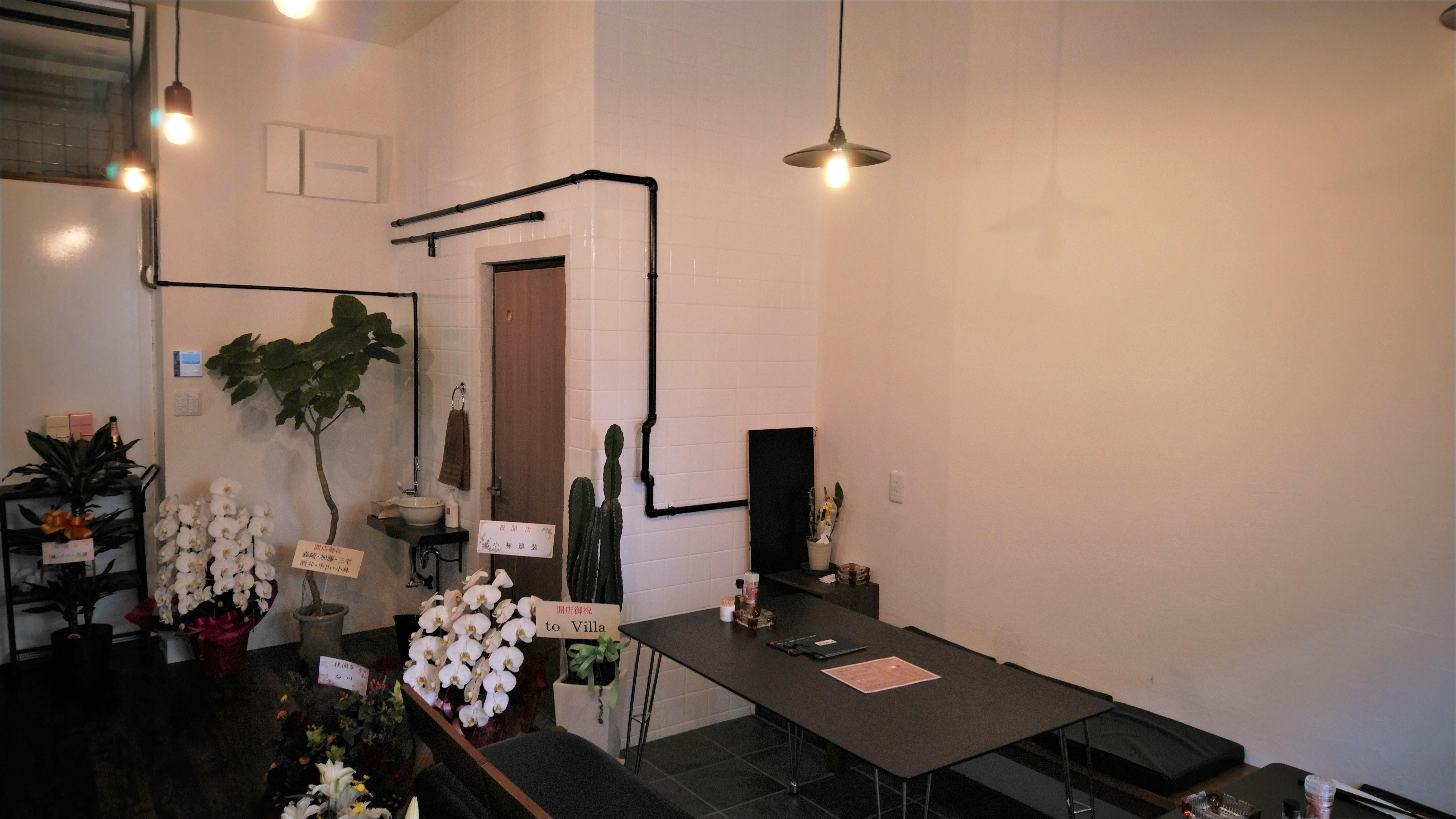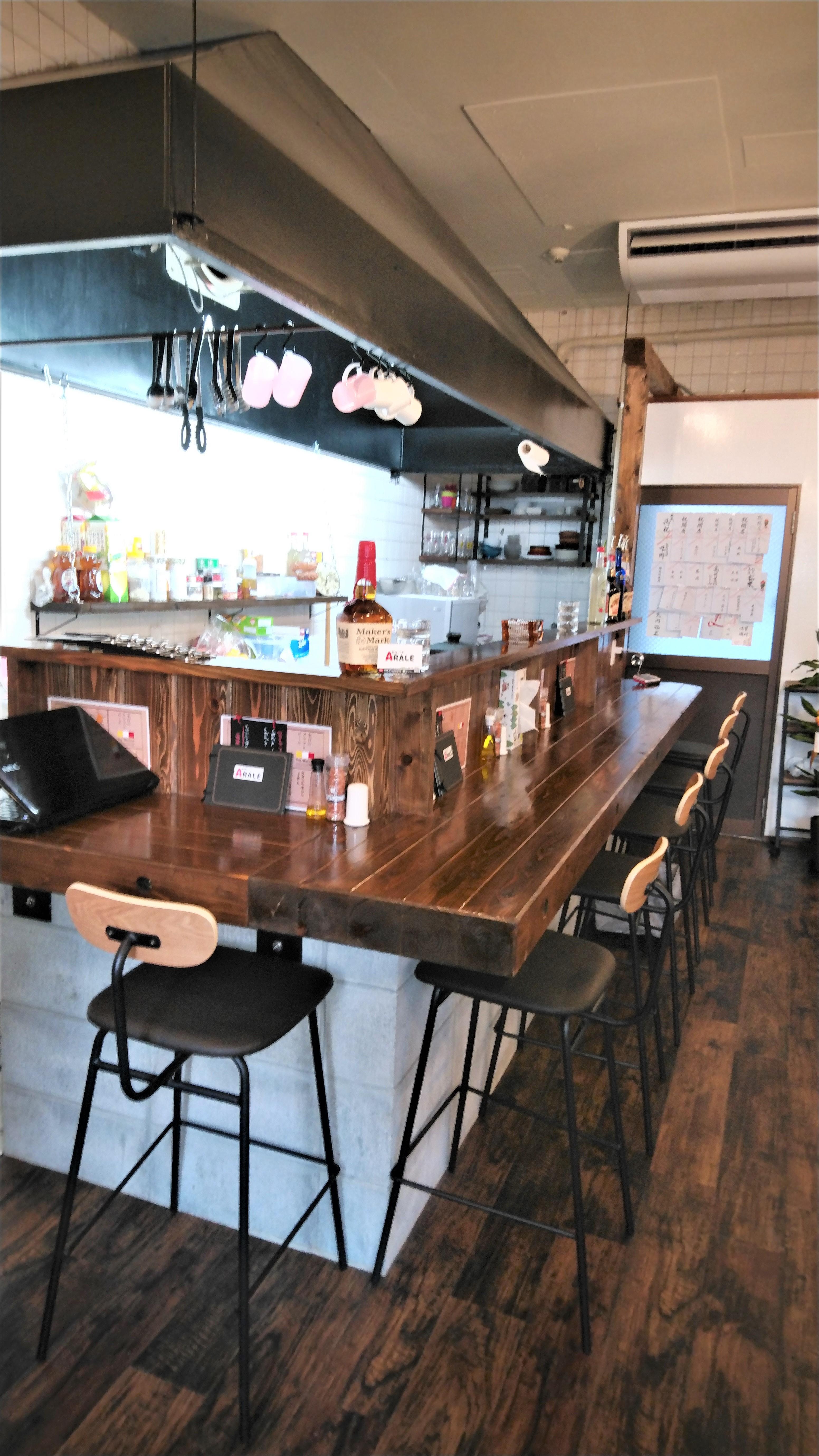 三木市緑が丘商店街の1画。以前はお豆腐屋さんだった店舗を創作バルに改装したいとのご要望でした。 既存の大きな換気扇フードは生かして、お店のポイントに。 オーナーがお客様と談笑しながら料理をつくれる対面カウンターは、壁をブロックで立上げ、 カウンター材は角材を組み合わせて造作しました。 木目の質感を生かした仕上げになっています。 異素材を組み合わせたおしゃれな空間が出来上がりました。
