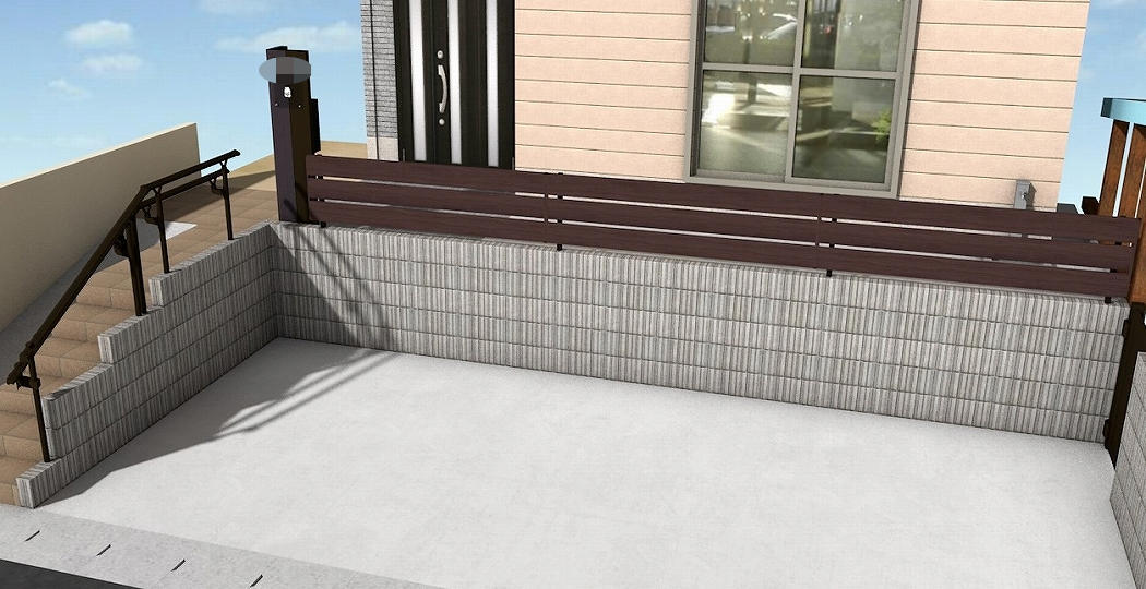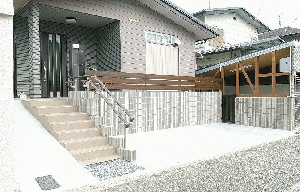 施工後のイメージがわかりやすいように、パースを作成し、プランをご検討いただきました。 アプローチの方向を変え、駐車スペースを増設しました。 アプローチの横には車いす用のスロープも設置。 手すりもつけて、出入りも楽になりました。