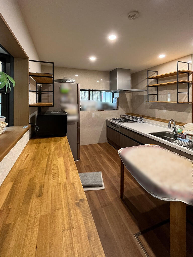 元々コの字型の立派なキッチンでしたが、リフォームにあたり、シンクとコンロの位置を変えてみました。 収納はアイアンと集成材をつかって欲しい位置に、お洒落にカスタマイズ。 スッキリとして使い易そうですね。 汚れにくくお掃除しやすいように、キッチンパネルを出窓側一面にも貼りました。 床材も木目の美しい柄をセレクトしました。 使い易そうなキッチンで、お料理するのが楽しくなりそうですね!