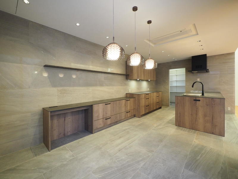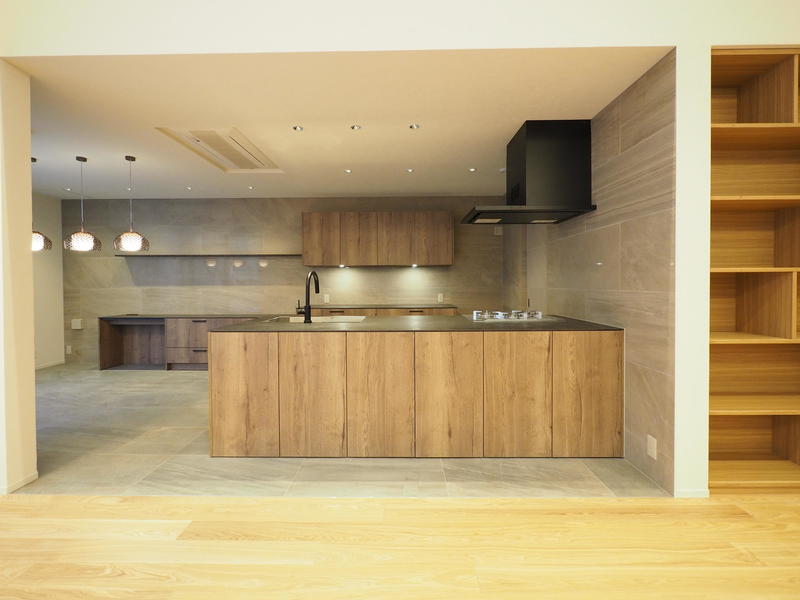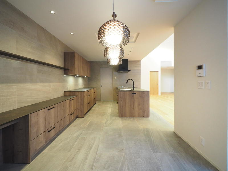 キッチンは、床や壁にグレー系の大判タイルを施し洗練