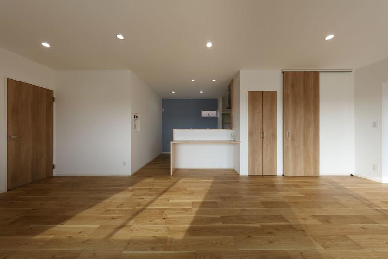 ブルーのアクセント壁が綺麗なLDKを中心とした間取り