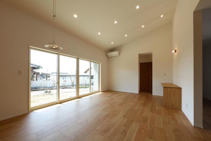 平屋ならではの開放感ある勾配天井と、両引き分けの