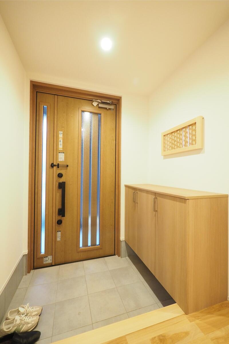 全体的にモダンな空間に仕上がるよう低トーンのクロスを選定され、アクセントで遊びを入れています。玄関インテリアには”タニハタ組子”をオーダー寸法にて採用。