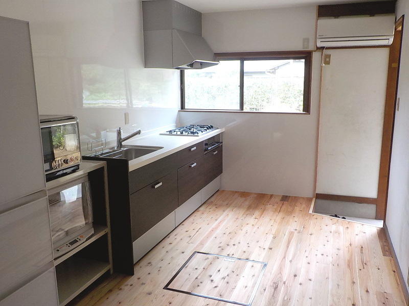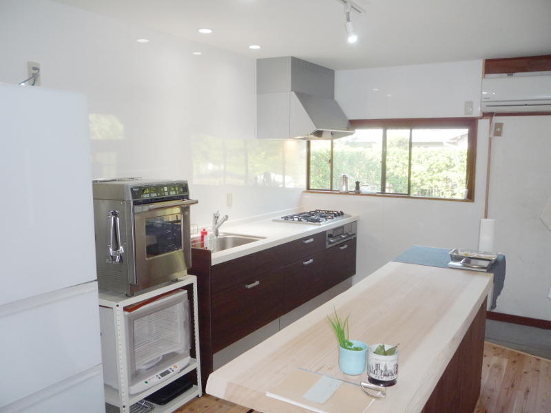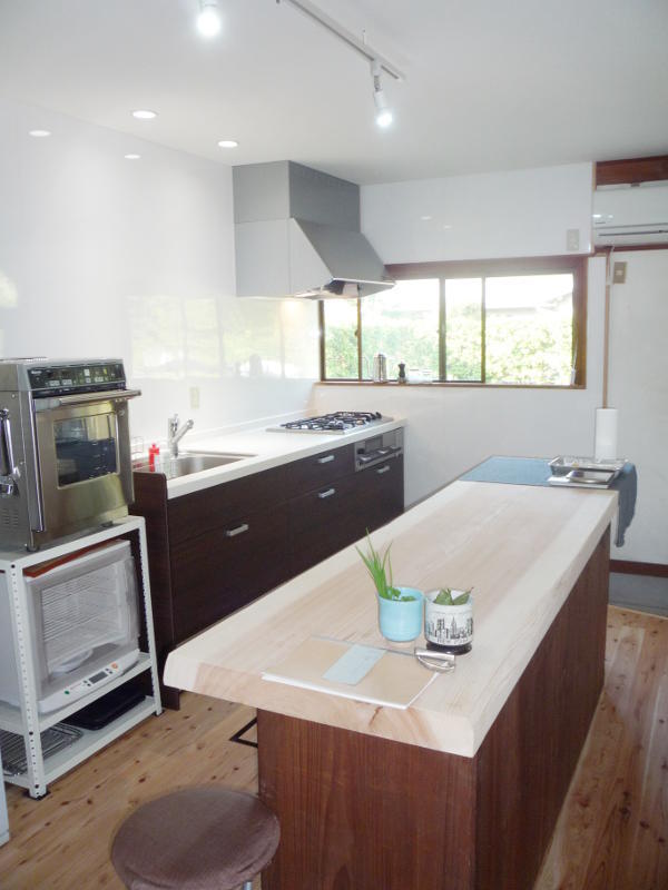 お客様のご要望で、床は肌触りの良い杉の無垢材を使い、壁は清潔感のある白のキッチンパネルをキッチン正面の壁を中心に大きく使用。お客様が別途ご用意された照明と作業台にマッチした、モダンで落ち着きのある空間に仕上がりました!