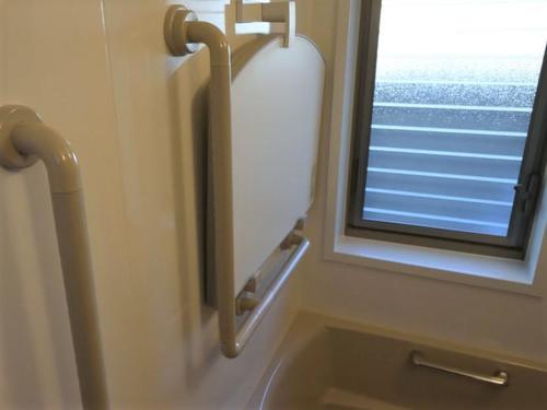 L型ハンドバーに風呂フタフック機能を合わせ、背もたれ側の壁面を上手く有効活用しています。