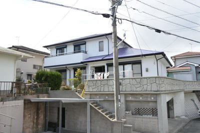 外壁、屋根全面塗装を行い、新築のような白く輝く壁と紺色のかっこかわいい屋根のオシャレな外観へ生まれ変わりました!