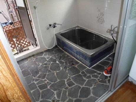 段差のある入り口と石張りの床、そしてステンレスの低めの浴槽。将来を考えるとつまずきなど心配ですね。奥に勝手口がありました。