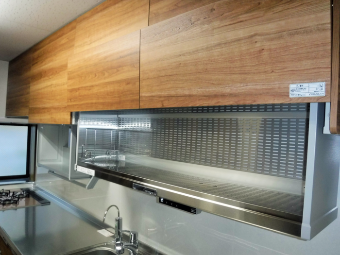 キッチン上部を上手に使える吊戸棚タイプの収納があります。ワンタッチで昇降でき、使う時は目の高さに、使わない時はキャビネットに収まります。(写真は使用時の様子)装備されているキャビネットはステンレス製なので、サビ、水・油汚れ、熱にも強いく、カビやニオイもつきにくい。汚れも一拭きで美しさが長持ちし、長寿命で、とってもエコです。キッチンの上下に設置されたキャビネットで収納力がとても高いので、キッチンがスッキリ片付きそうです。