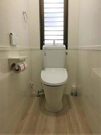 和式トイレでしたが、ご使用が不便ということで洋式への取替を決心したそうです。ガンコな水アカや汚物を落とせる衛生陶器「アクアセラミック」を使用しているので、日ごろのお掃除がラクラクです(^^♪便器のフォルムがシャープなので、床掃除もお手入れ簡単!壁や床も張り替えて、以前よりも温かみがあり落ち着ける空間になりました!LIXIL アメージュZA 採用