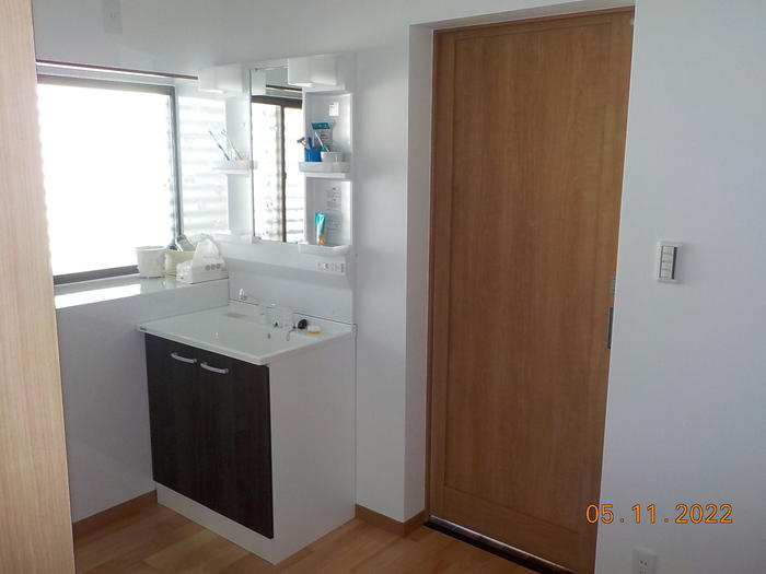 洗面化粧台はお客様支給品の為、工事代金に含まれません。建具やクロスなどを変え、すっきりとした広々な洗面所になりました。