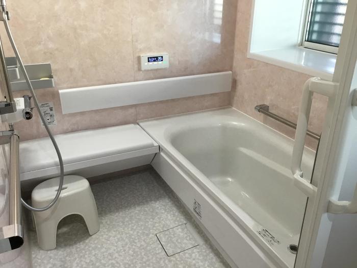 TOTO サザナFタイプ採用座りやすい高さ、形状のベンチが特徴!ベンチの背もたれと浴槽のフチ部分が握りやすくなるように配慮されたユニバーサルなデザインです。
