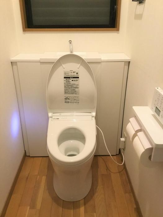 便器の後ろの邪魔にならないスペースを収納として有効に活用できます。TOTO独自開発の機能がいっぱいでトイレのキレイが長持ちします。クロスの貼替えもし、清潔感のあるトイレ空間になりました。
