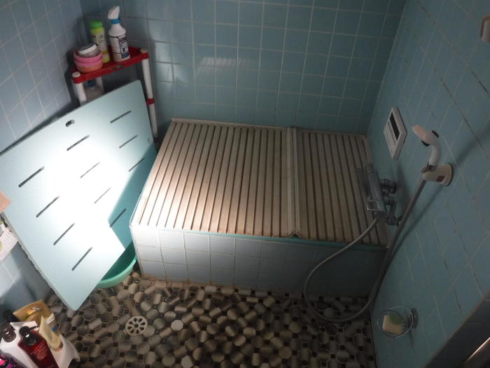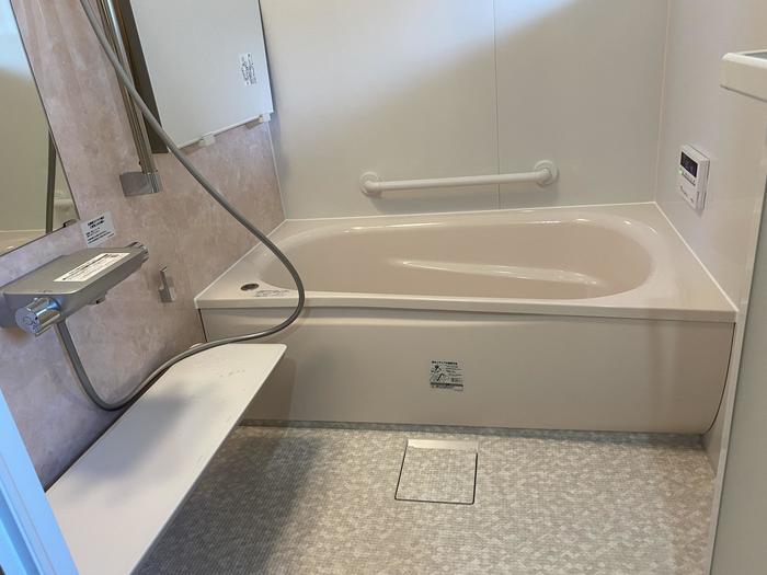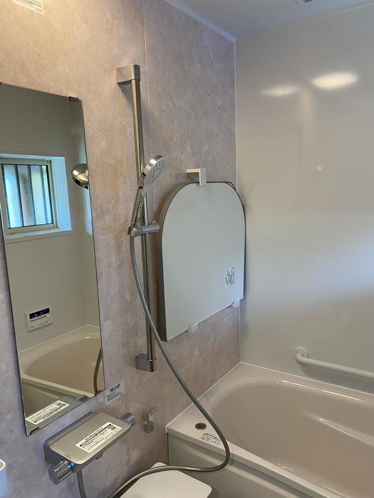 シャワーバーは自分でちょうどいい高さに調節できるので、みんなが快適な高さでシャワー浴を楽しめます。淡いピンクのアクセントパネルでほんのり温かい雰囲気の浴室になりました。