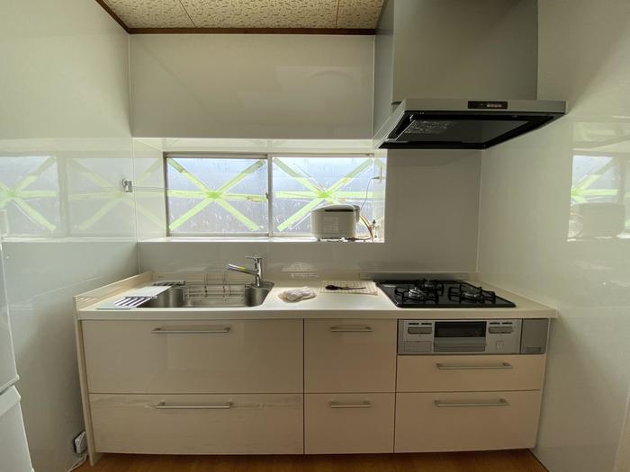 換気扇は撥油コートを施したファンが回転することで、ファンの付着油を軽減できます。フード本体は凹凸が少ないデザインなのでサッと一拭きでお手入れが簡単です。キャビネットはセンターラインで分割して、よく使う物の出し入れをしやすくなっています。背の高いボトルも立ったまま収納できる位の収納力があります。キッチンの壁は熱や湿気に強いキッチンパネルを貼りました。硬くて傷に強く、お手入れも簡単です。