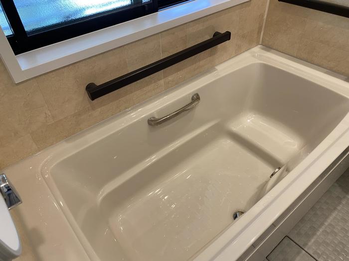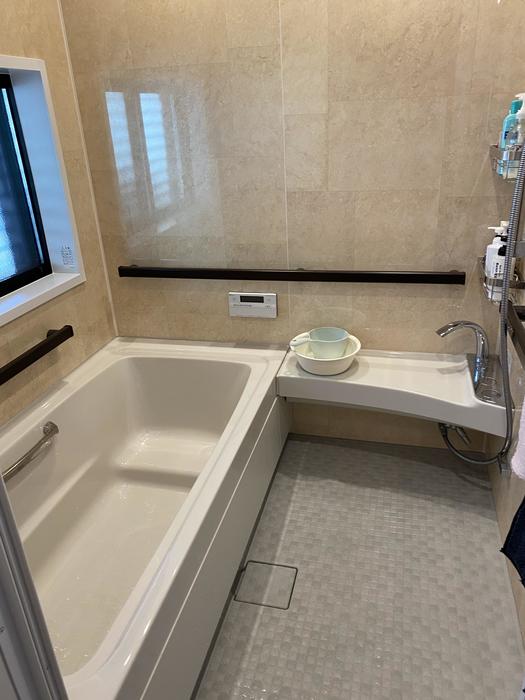 【マルチボード浴槽】をご選定。浴槽ラインナップの中で、底面長さが最も広く、のびのびした姿勢で入浴できます。ステップを備え、背の低い方でも安定した入浴姿勢をとることができます。【浴槽内握りバー】は浴槽内の姿勢保持などをサポートします。断熱性が高い【サーモバスS】で4時間後でも湯温は約2.5℃しか下がりません。