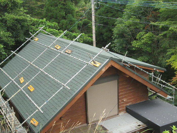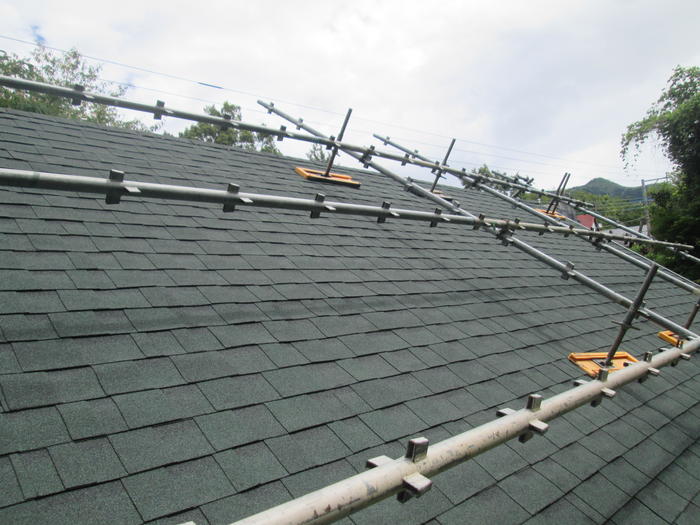 既存のコロニアルの屋根を剝がさずに、アスファルトシングルをカバー工法で施工しました。 防水性に優れている雨漏りに強い屋根材です。 葺き替え工事よりも工期が短く済み、工事費も抑えられました。
