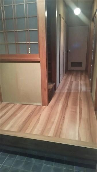 廊下床の老朽化、床鳴りがお困りでしたので、下地補強をご提案し、日常生活で生じる様々な傷やヘコミに強さを発揮し、美しさを長持ちさせる床材に貼替えました。