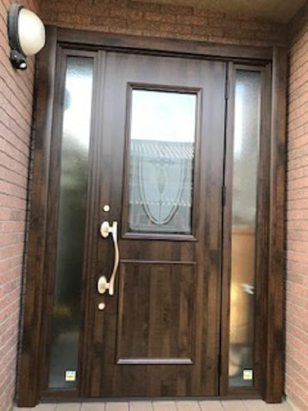 ドアクローザーの故障と、ドアの組子の角のほこりの掃除が大変なので、お手入れしやすい玄関ドアをご要望でした。両そでのガラスのデザインが決まっていて、ガラス1枚だったので防犯ガラスをご提案させていただきました。デザインも気に入っていただけて良かったです。「玄関ドア:LIXIL リシェント」