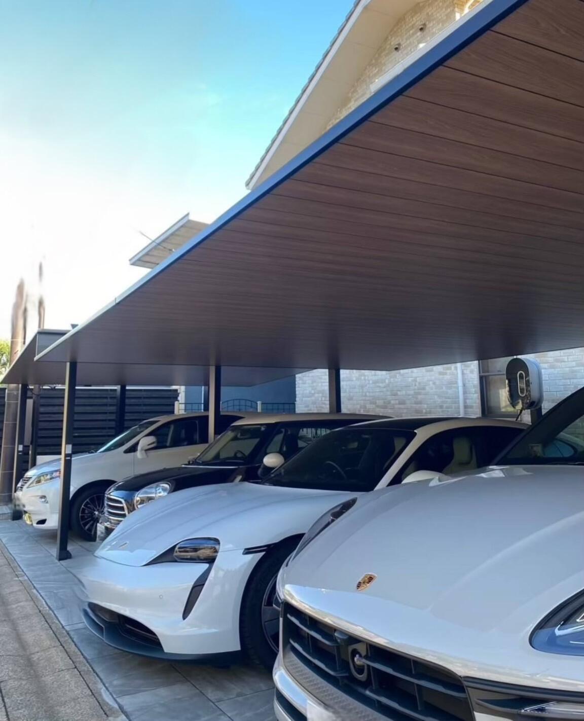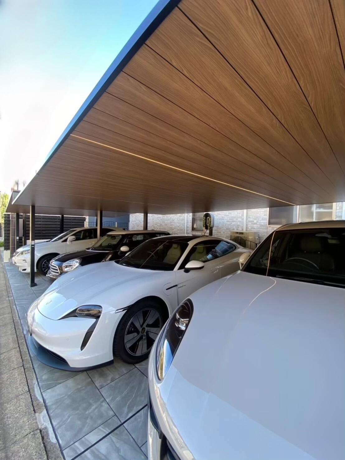 間口14mのカーポートの商品が無く、また前面道路に高低差があるため、この条件の基に、住宅のデザインと調和できるカーポートの組合せ方がポイントとなっています。後方支持カーポートの設置向きをを横向きにすることで、敷地を最大限に生かしながら、極力柱をなくしスタイリッシュなガレージになっています。