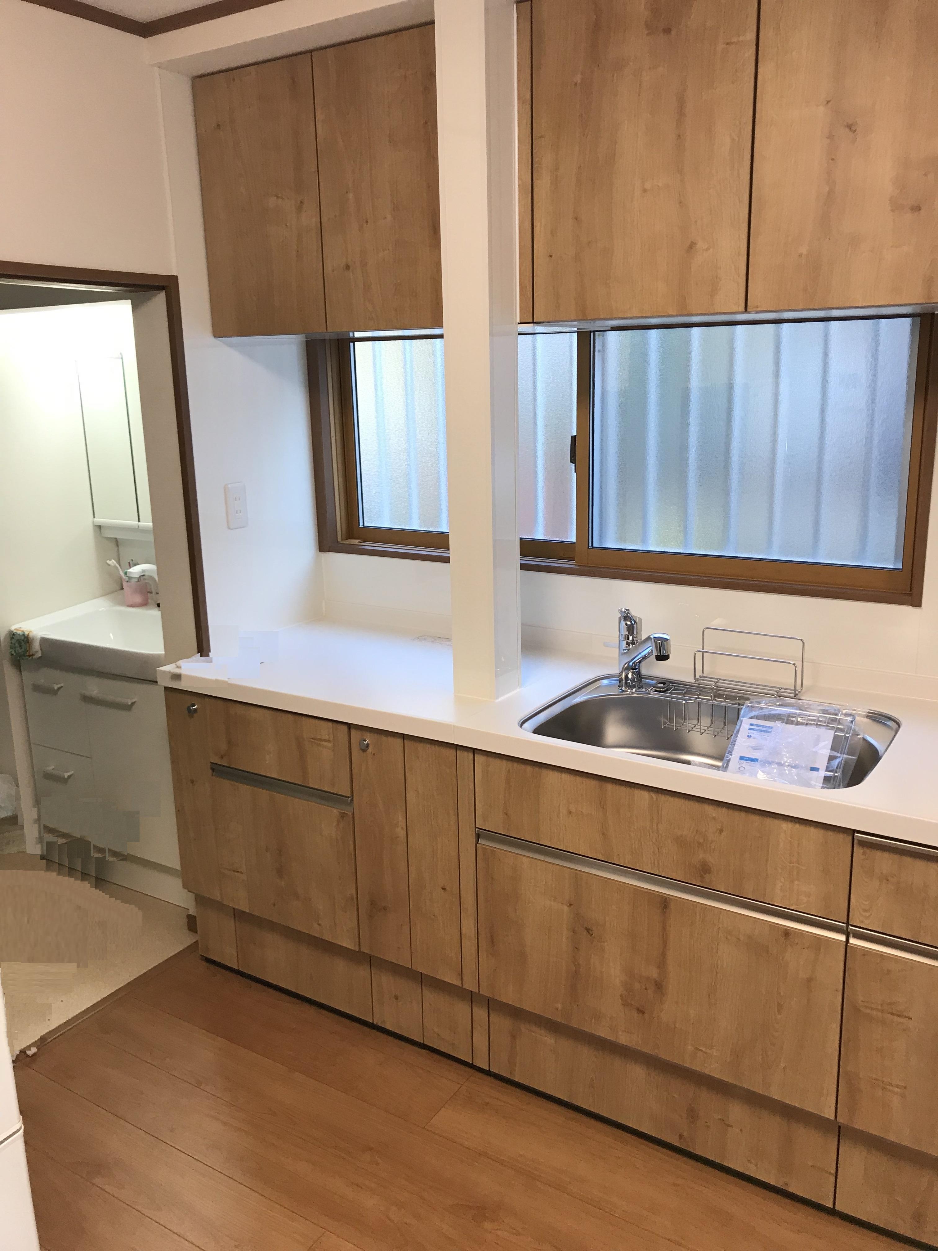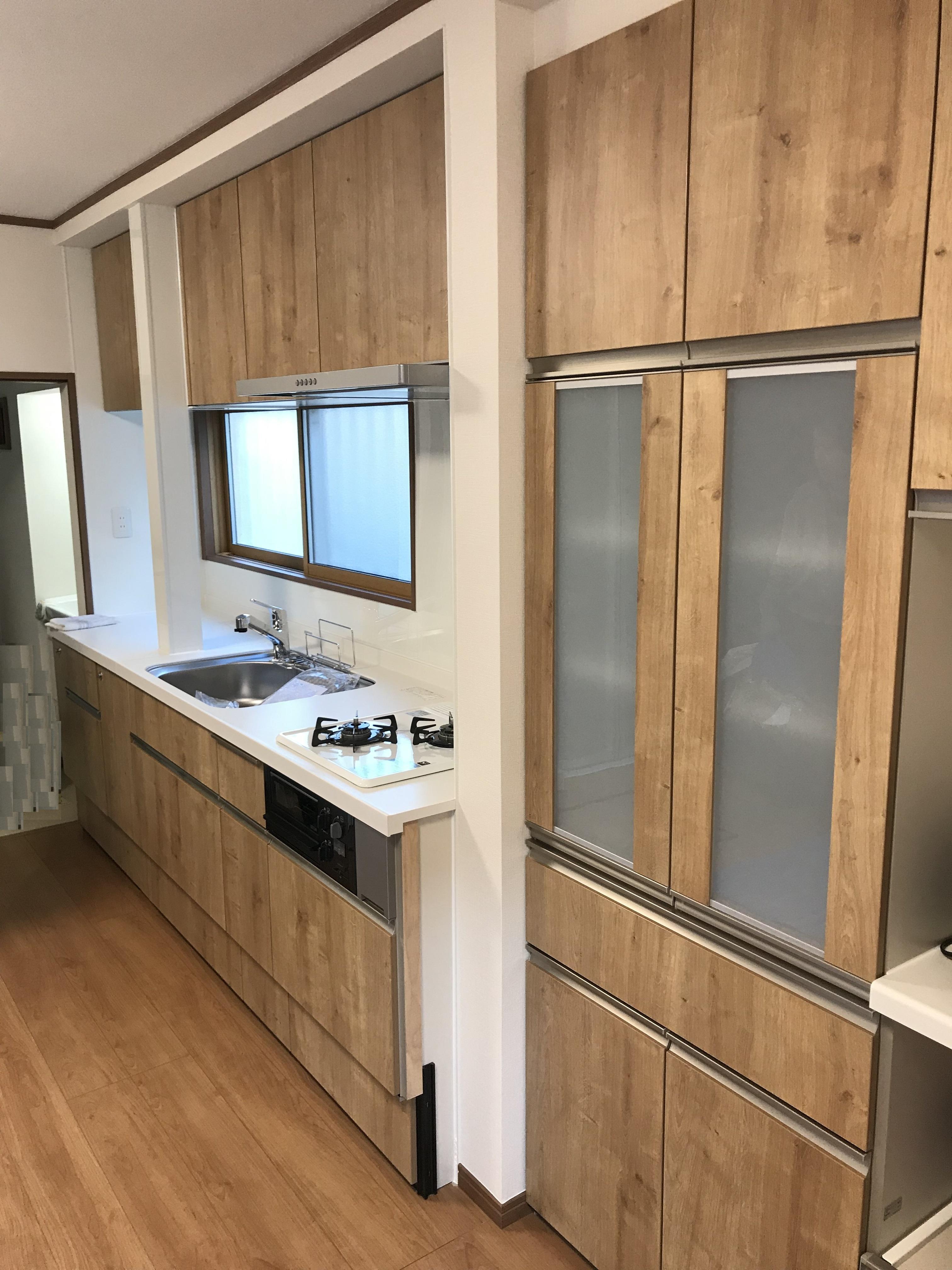 写真右側はキッチン本体と収納ユニットで分けられたのですが、左側は間口が狭いので化粧柱とし、