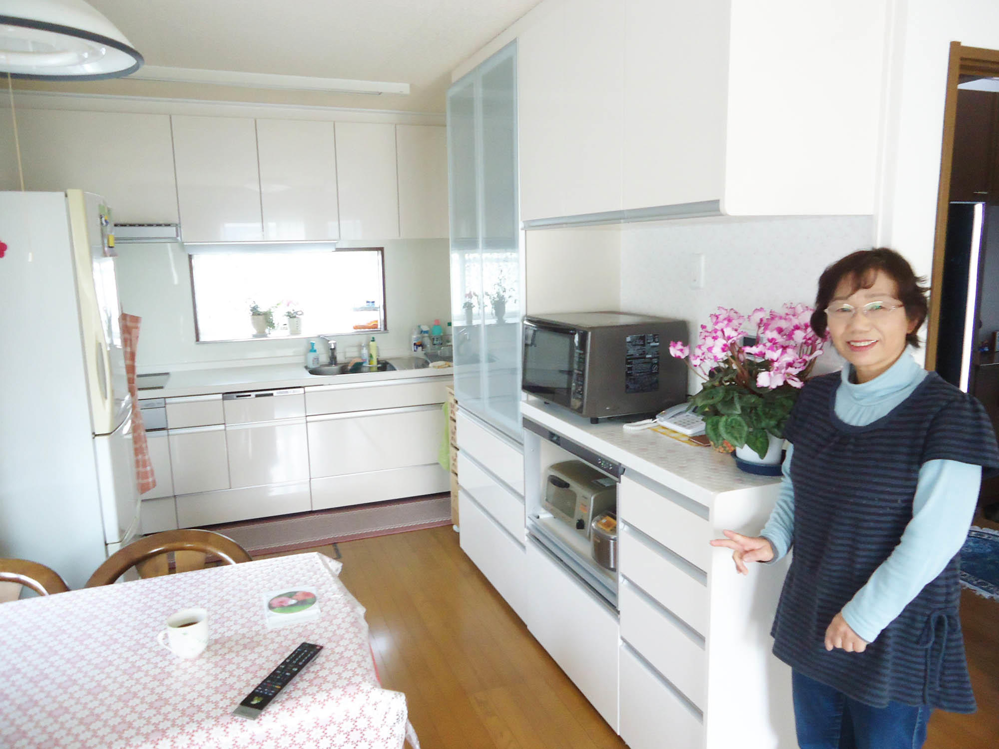 キッチン:以前の茶色を基調としたキッチンから白で統一されたキッチンへ。キッチンを変え色を白くしただけで部屋も明るくなったように感じられます。キッチンリフォームと合わせてサッシや手すりの工事も行い、ペアサッシにすることで冬の結露や冷え込みに備えました。新しくなったキッチンを見るたびに奥様は「やっぱりいいわね」と見とれてしまうそう。これからもずっと住む家ですので、キッチンのリフォームをすることでより楽しく過ごしていただきたいです。