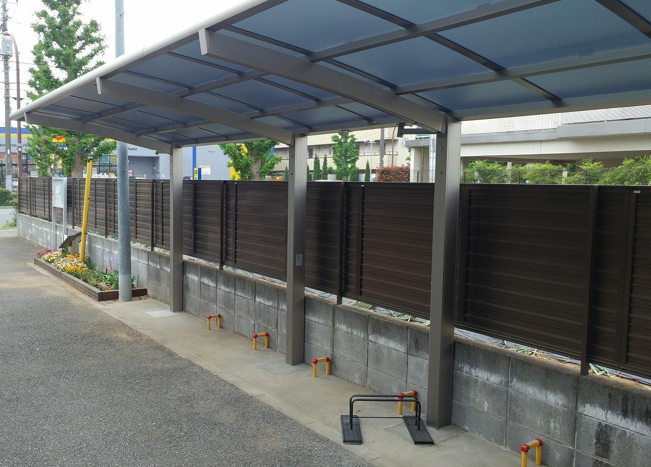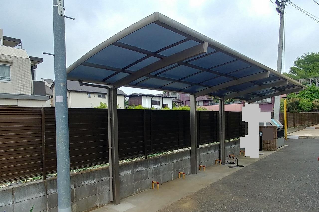 賃貸物件のオーナー様からのご依頼。 自転車8台位を置きたいとのご要望でしたので、 通常のサイズを2つ繋げた縦2連棟タイプをご提案。 計算上10台ほど停められるので8台は余裕のある配置となりました。 フーゴRミニ/縦2連棟/W18/L36・43/標準柱(H19)/熱線吸収ポリカーボネート屋根材使用(ブルーマットS)シャイングレー