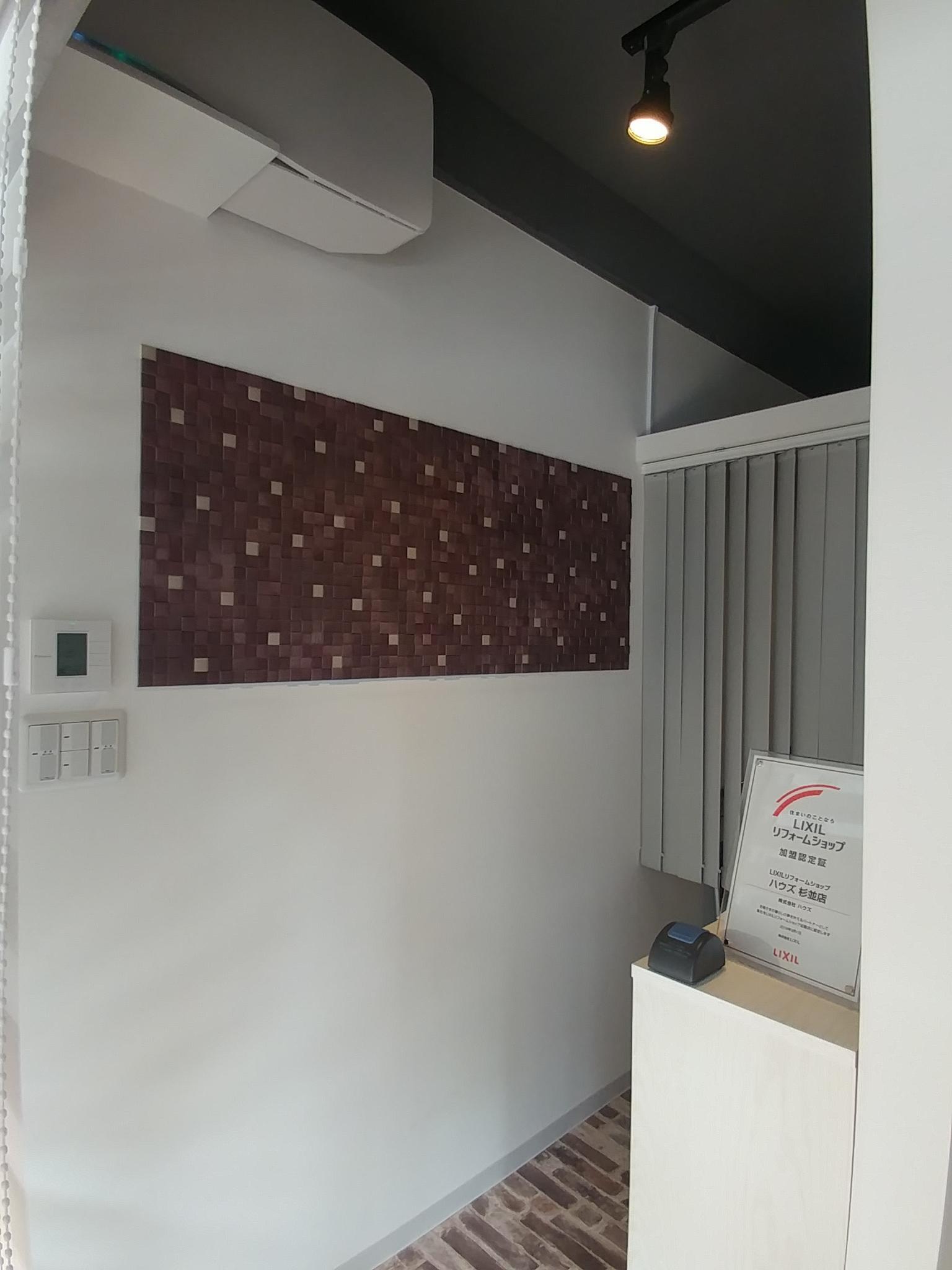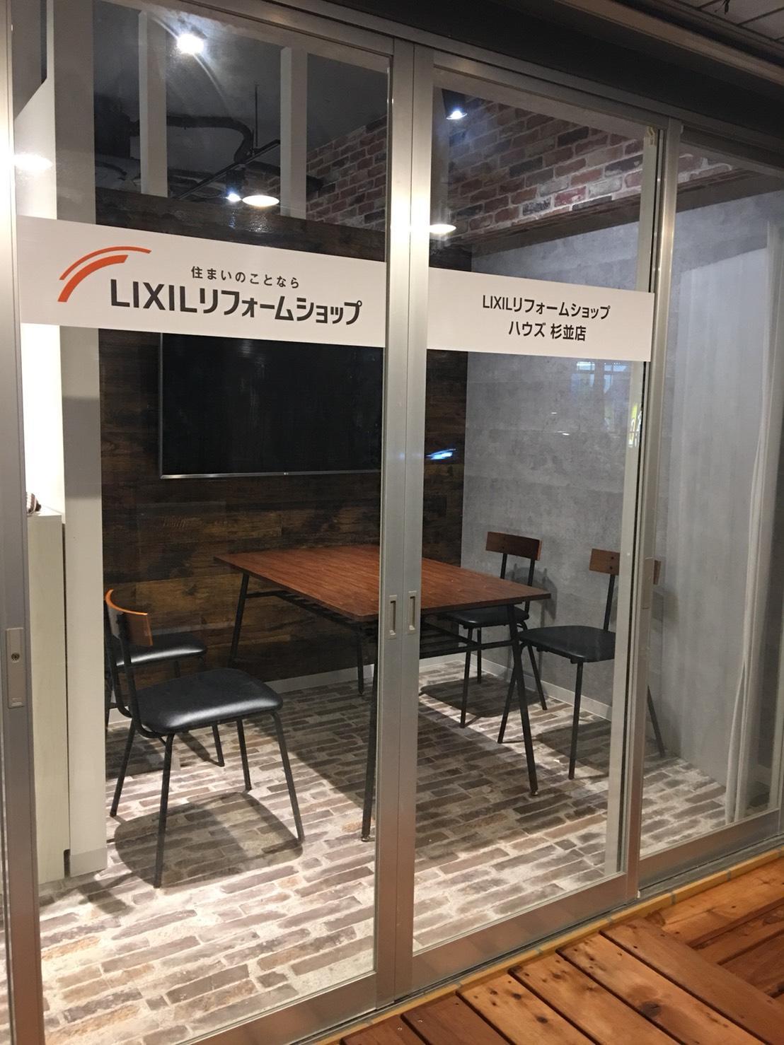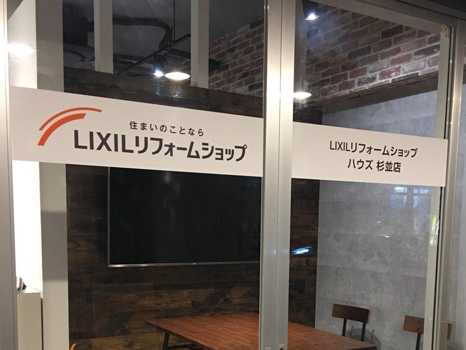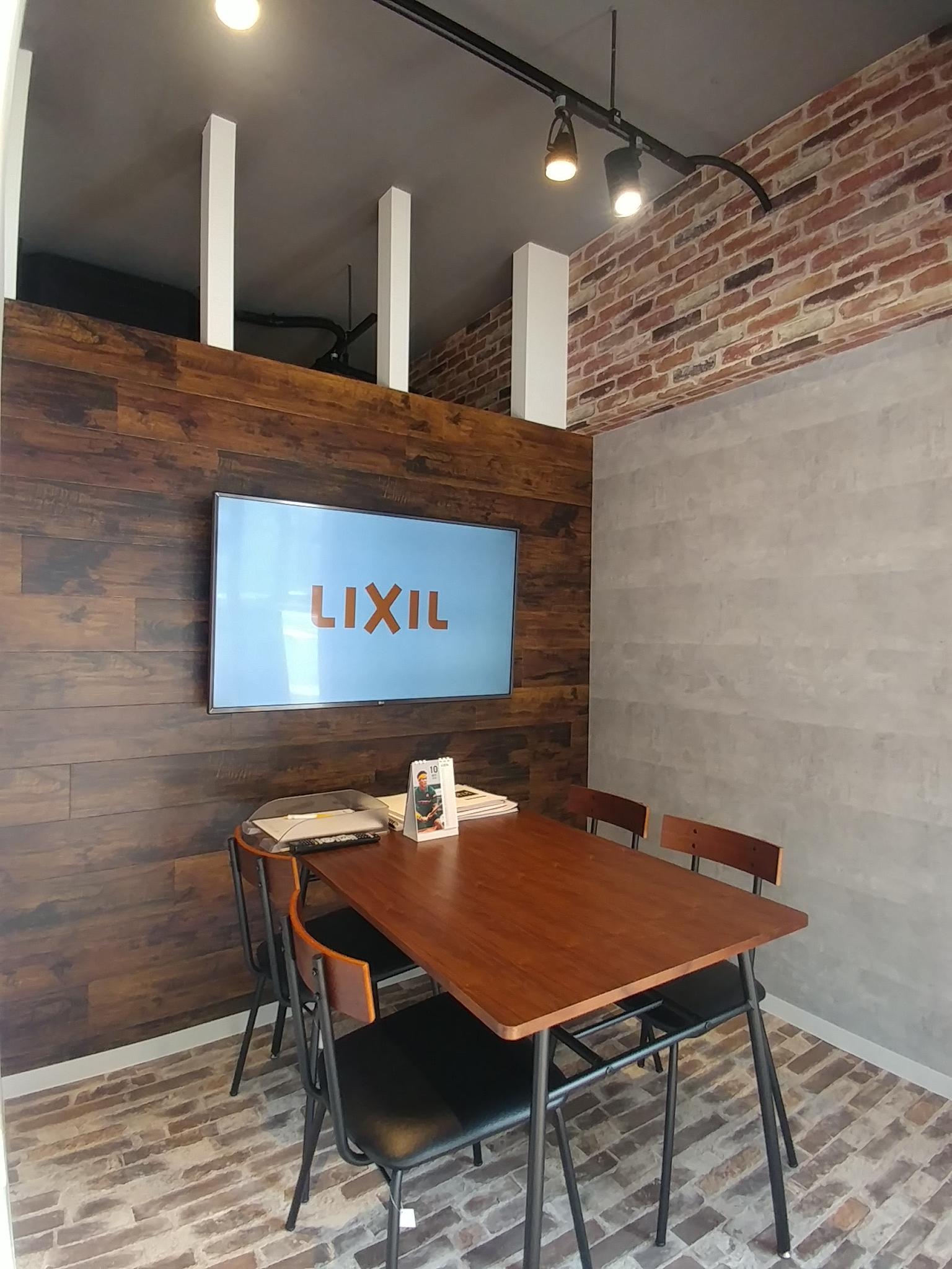 外部の工事が終わり、家具や液晶モニターの設置が完了しました。 外部は電飾のランマサイン(看板)とウッドデッキが設置され、一段とLIXILリフォームショップ感が出てきました。 店舗スペースには49インチの液晶モニターを壁付し、本棚やお打合せ用テーブルの設置も終わり、工事完了しました。
