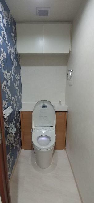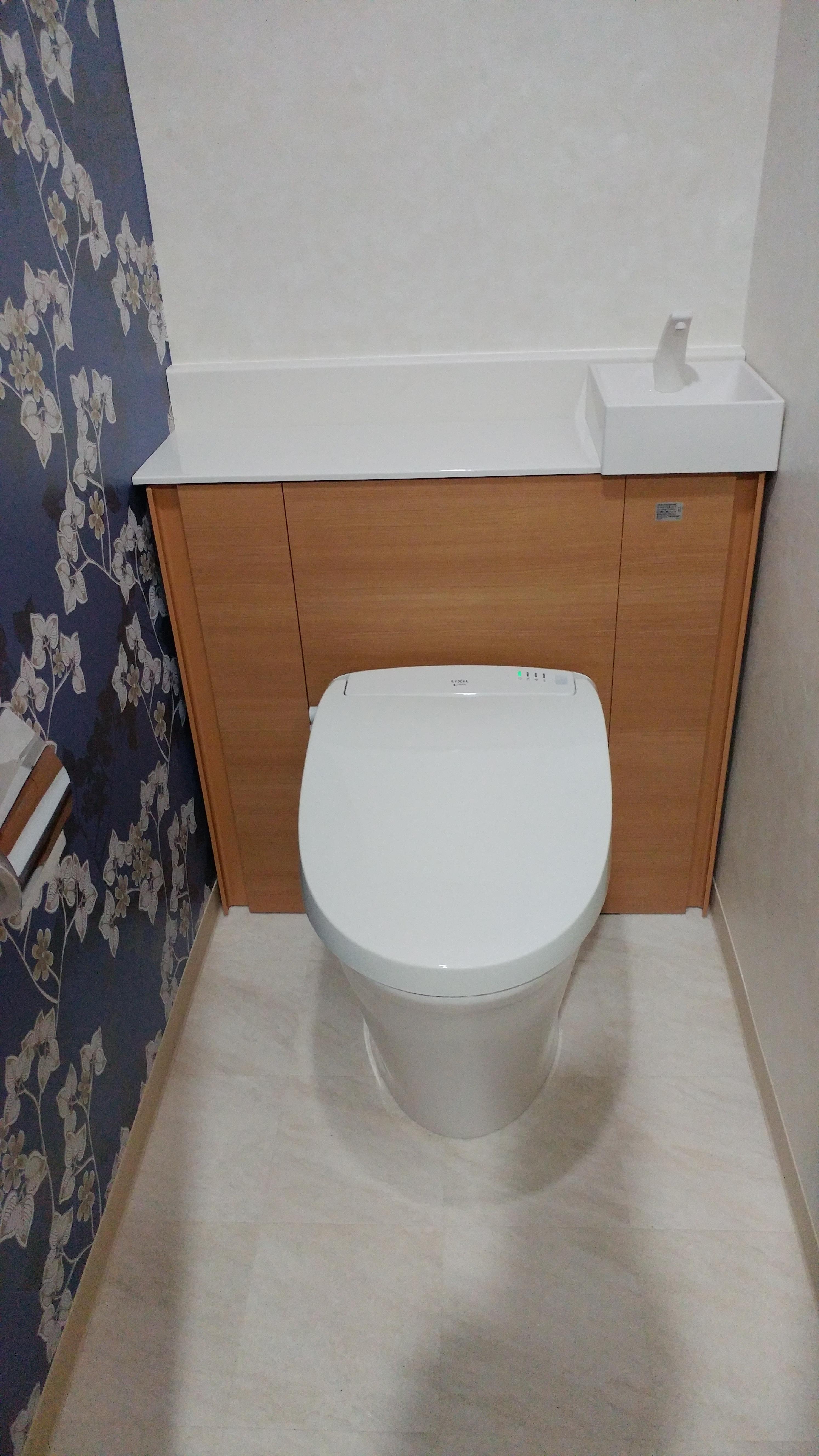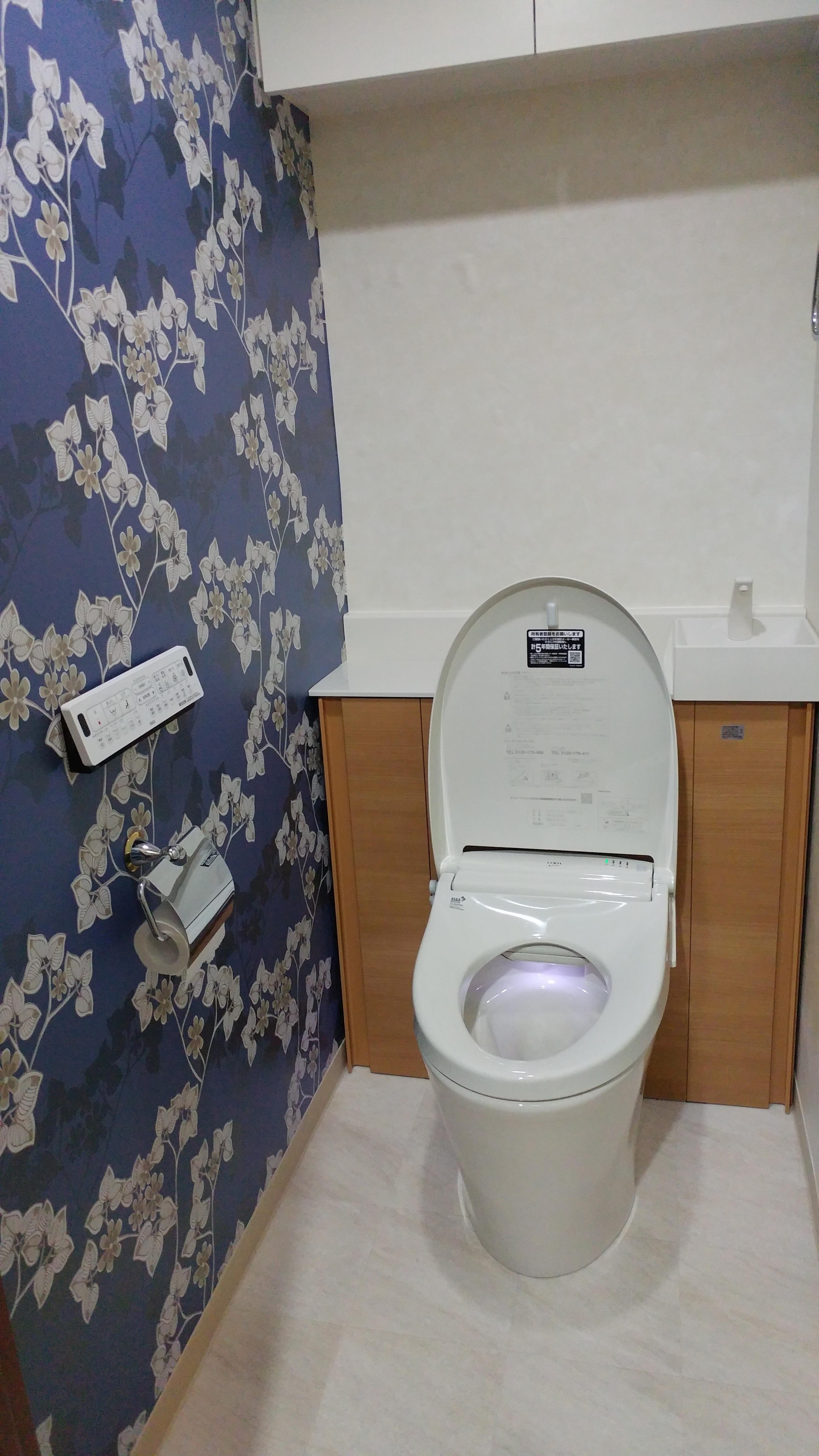 ユニットバスと共にトイレもリフォームされたS様。 収納付で向かって左の配管が見えなくなるのでリフォレにしました。 内装のクロスとCFシートは、奥様とお嬢様で決めたとの事で花のモチーフです。 大柄で印象的でとてもセンスが良いですね。