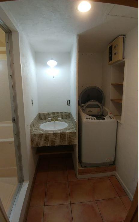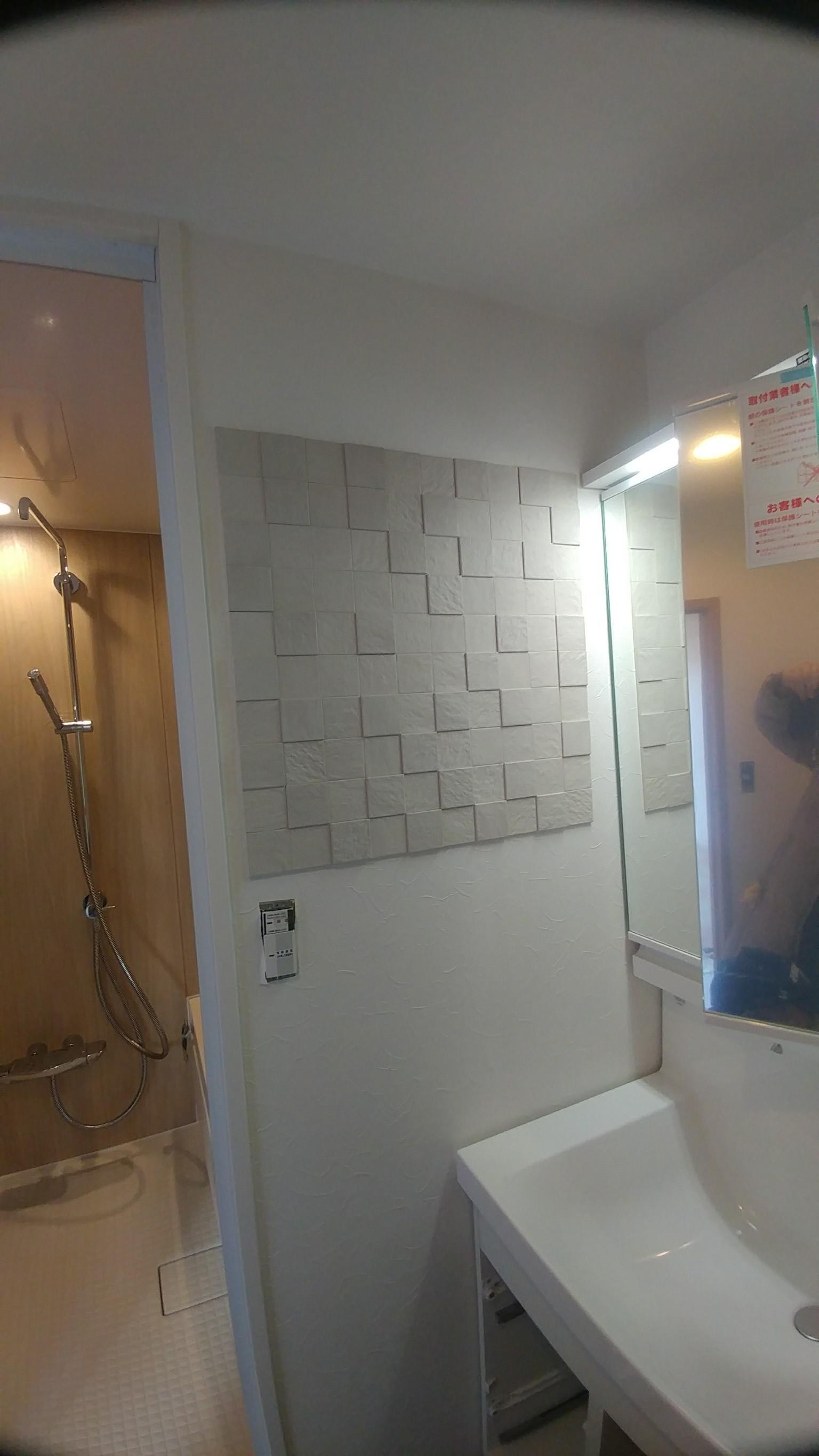 浴室と洗面室のリフォームのW様。 洗面はカビが生えやすく収納が少ないので洗面の下に収納のあるタイプでL.C.になりました。 床だけは既存のテラコッタタイルを残しつつ、デザイナーである奥様のセンスで扉色はクリエペールとなりました。 洗濯機裏が風通しが悪くカビが発生しやすいとの事でエコカラットのデザインパッケージを2ヶ所に貼りました。