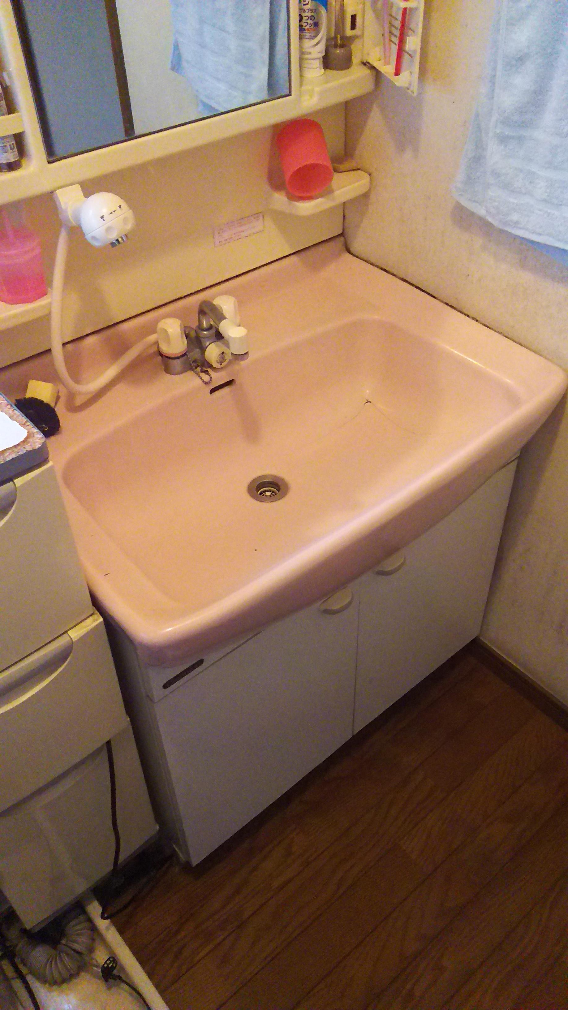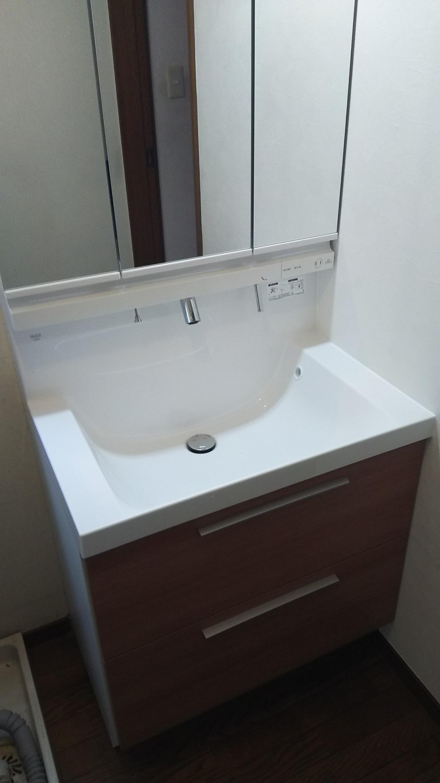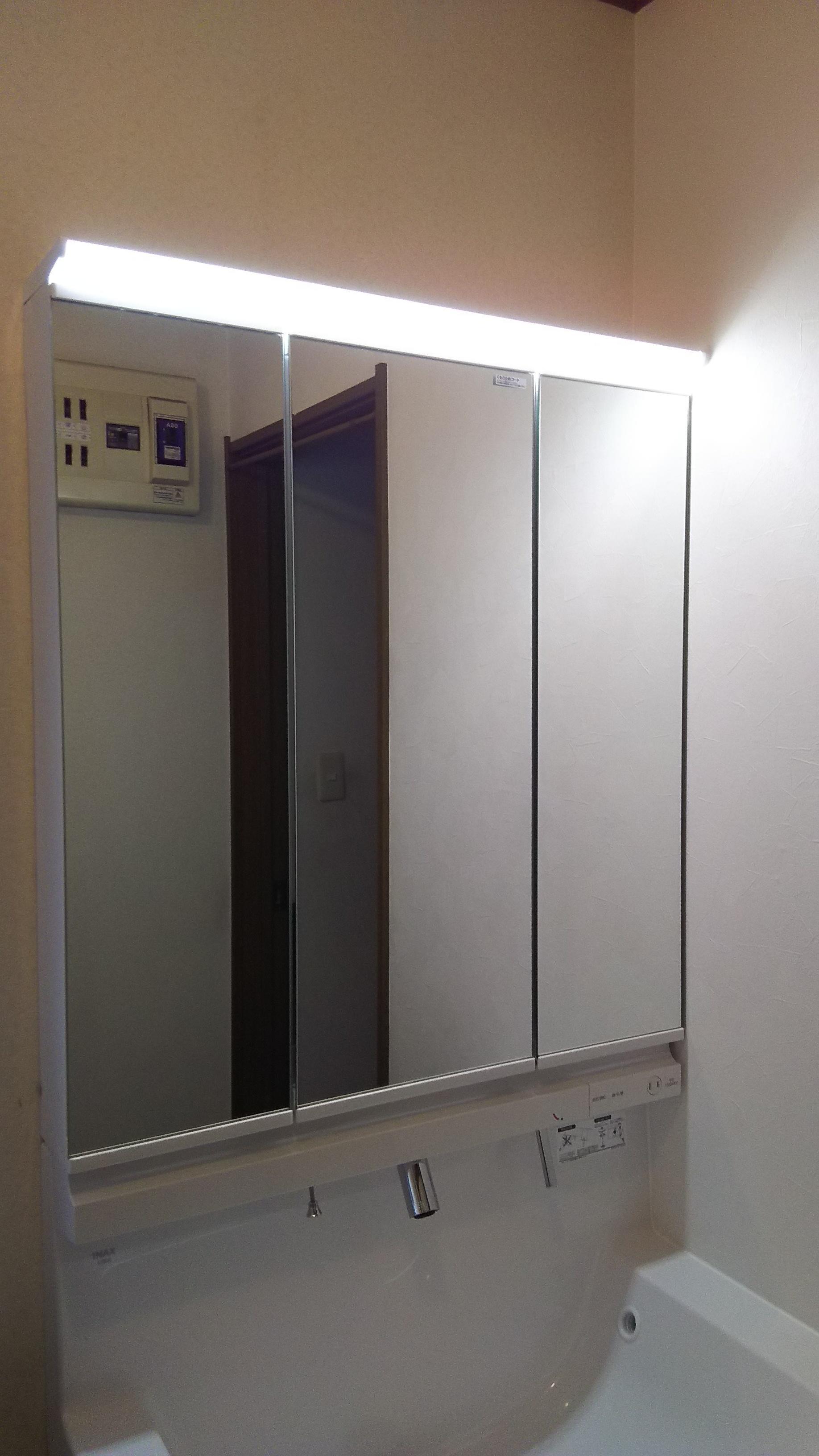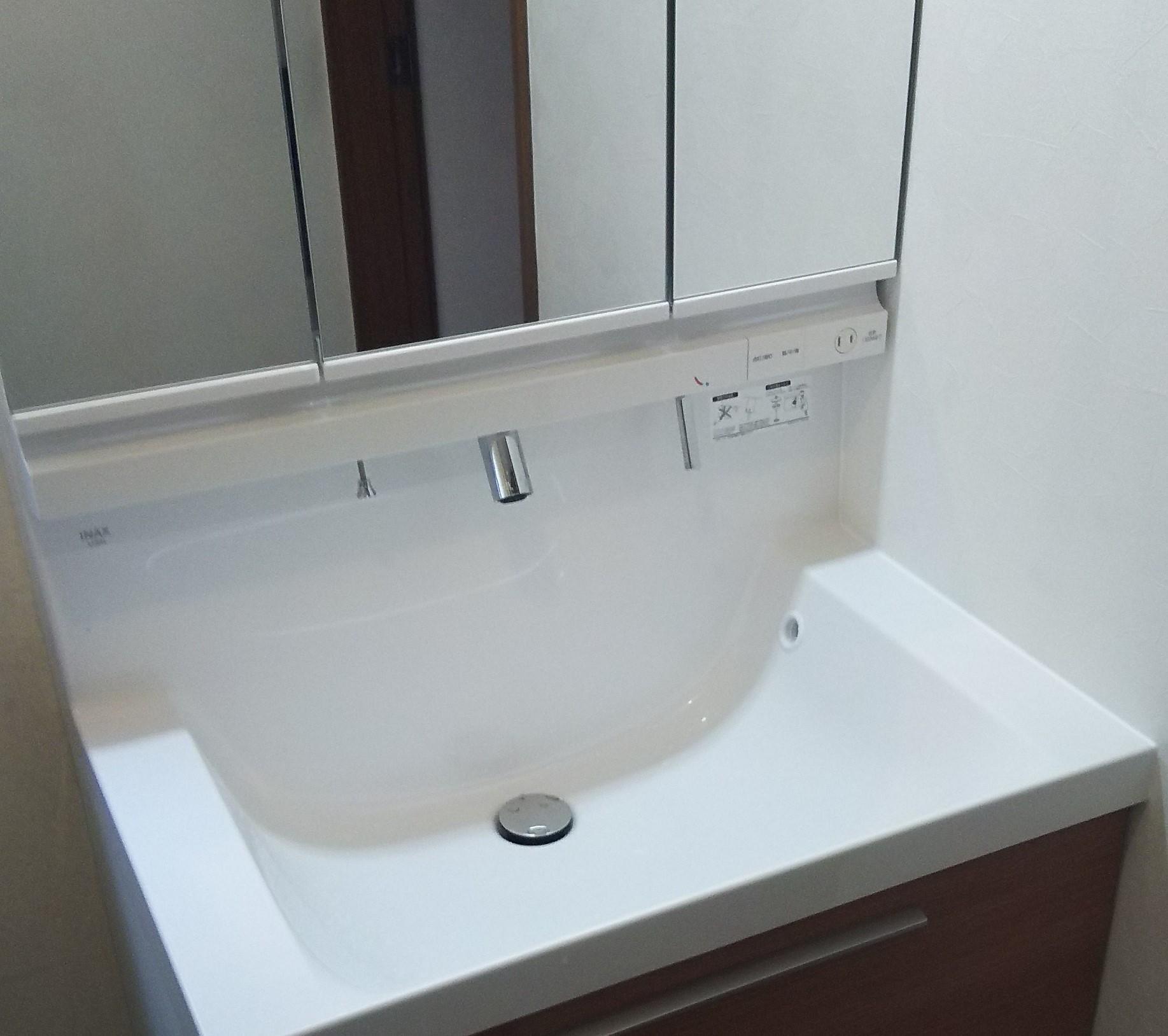 洗面化粧台が古くなり、ボウルも割れてしまったので、お客様の明確な御希望があったL.C.に交換しました。ミラーキャビネットも、三面鏡・全収納にし、脇に置いてあった収納が無くなり、すっきりしました。