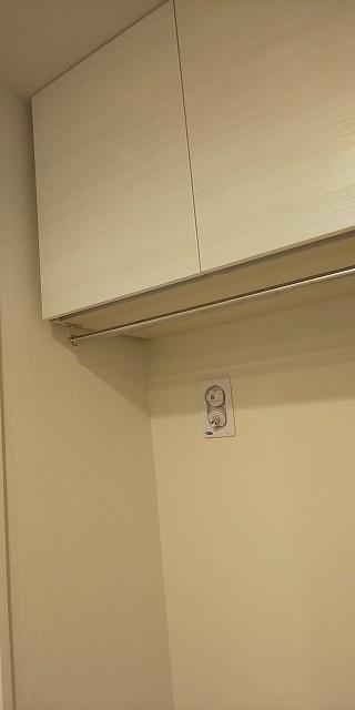 こちらも新築OPでは断念。でも私達ならと試しに聞いていただけました。家具造作になると高いので、キッチンの吊戸を流用しました。キッチン吊戸はサイズも豊富ですし、色もたくさん選べます。お部屋の雰囲気に合わせた提案をリーズナブルに対応出来るのでよく使用しています。吊戸下のハンガーは洋服用のモノを流用しました。S字フックなど使う事で洗濯機上の空間をより有効活用できます。