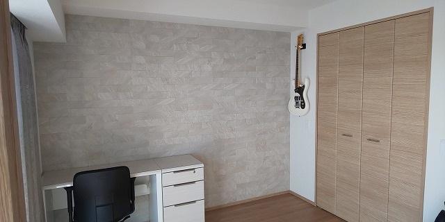リビングに隣接する書斎のエコカラット施工です。開閉間仕切りは開けていることの方が多いとの事でしたのでLDと同じもので提案させていただきました。ギターベースはサービス施工です。お持ちのモノを下地確認し、ないところはアンカーなどで対応させていただきました。