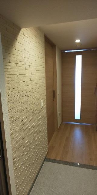 土間タイルや框の雰囲気が和モダン風でした。ここはお客様の希望のグラナスルドラで施工しました。ホワイトだと明るくなり過ぎるので温かみのある、そして和モダンテイストにも馴染みやすいベージュをおススメしました。家の顔である玄関。そして、疲れた体や心を癒す出迎えの場でもありますので雰囲気作りはとても重要です。よい雰囲気になりました♪