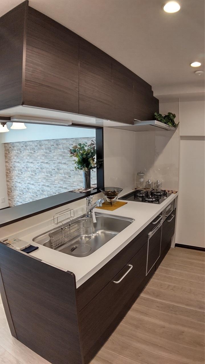 壁付けI型から壁付け対面タイプに位置替えしました。サイズも1800→2250と食洗器設置分の寸法をアップしました。フルスライドの引出収納に食洗器、ガラストップガスコンロ、整流板付きの換気扇と機能を充実させました。水栓金具も浄水機能付きのタイプでこの中に詰め込めるものはほとんど入っています。部屋の差し色のダークブラウンで落ち着いた高級感のあるキッチンに仕上がりました。・LIXIL:アレスタ2250間口