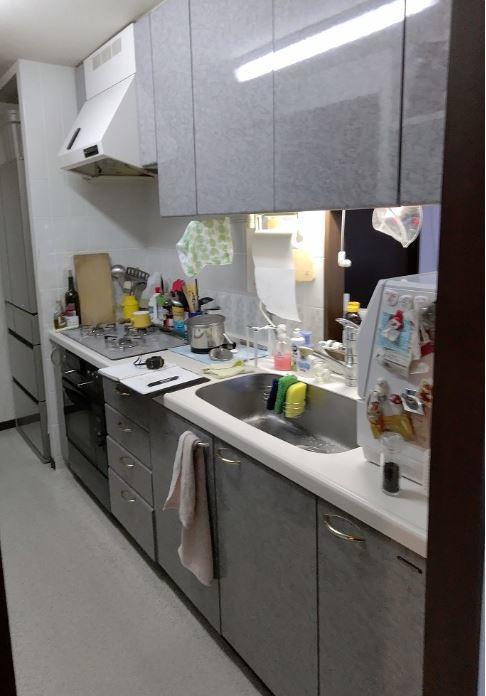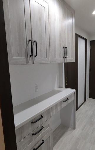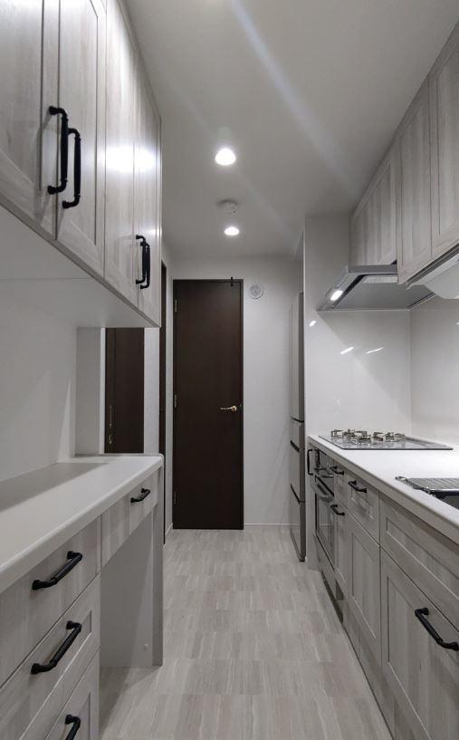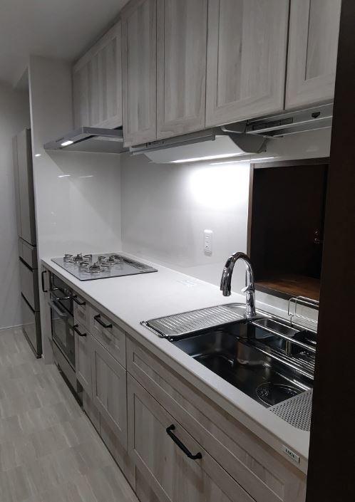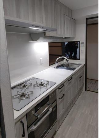 キッチン扉色に合わせて、床CFやクロスもグレイッシュにまとめました。