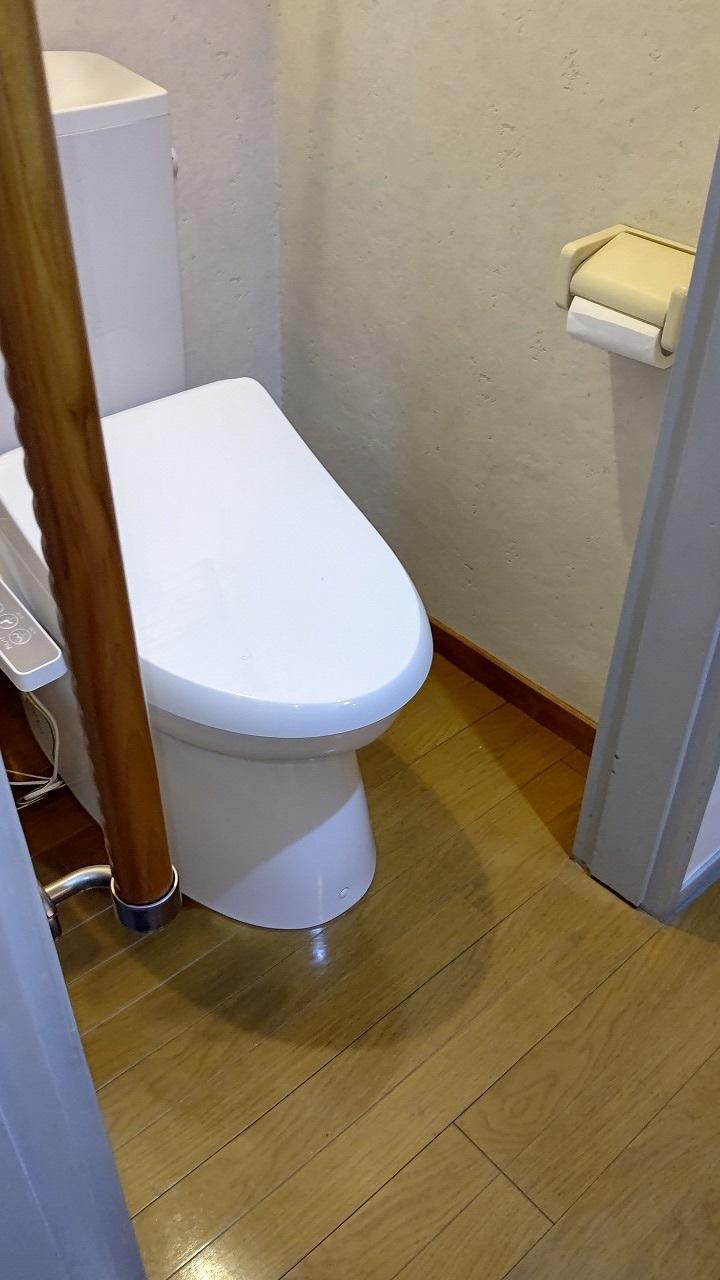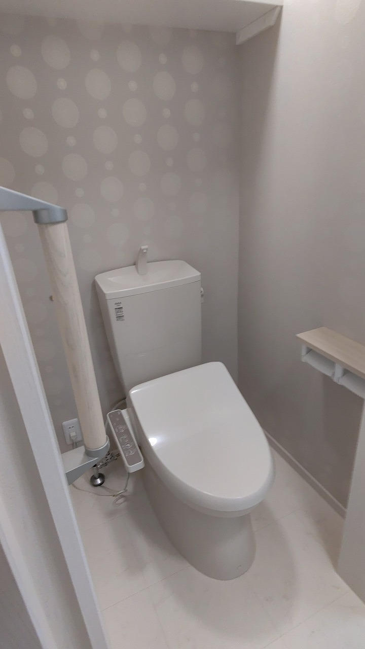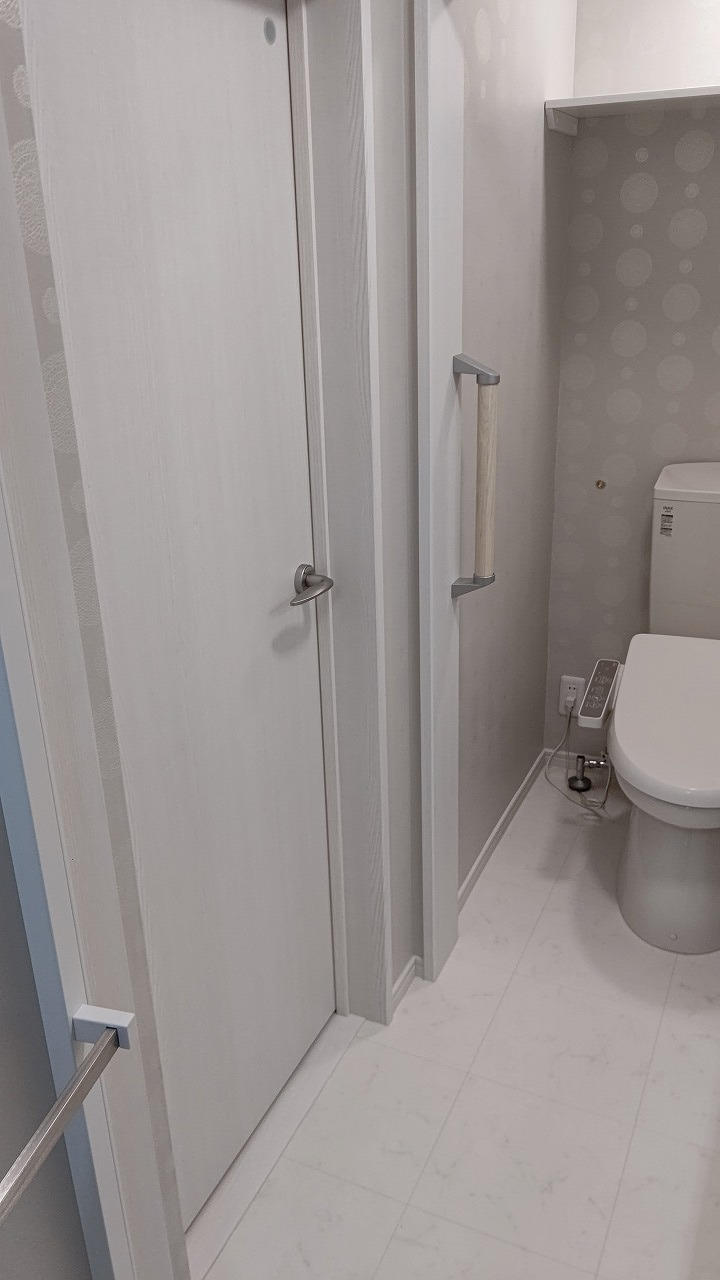トイレはほぼ新品でしたので、最低限の消耗材を取り寄せ、既存脱着にて(LIXIL製) 対応しました。棚付き紙巻器と手すりは今回の内装イメージに合わせ一新しました。