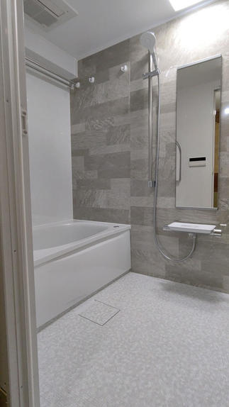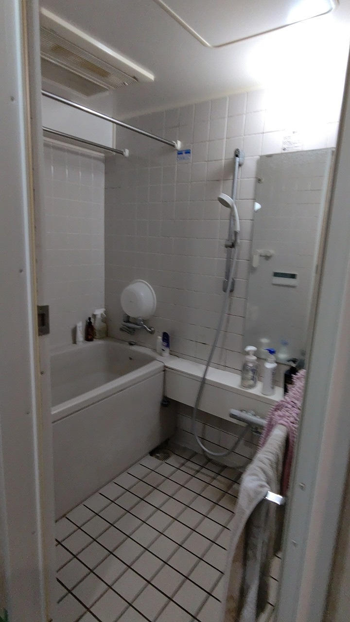 築25年ほどの集合住宅で浴室の汚れや傷み具合が気になり改修をしようか?となったそうです。この当時によくあったタイプのユニットバスで壁面と床がタイルで仕上がっています。FRP製でつるっとした床に比べると滑りにくいのですが、タイルですと目地がある為、掃除が大変です。そういった事からK様は滑りにくく乾きやすい床は絶対条件。そこに清掃性をプラスしたユニットバスに交換希望されていました。