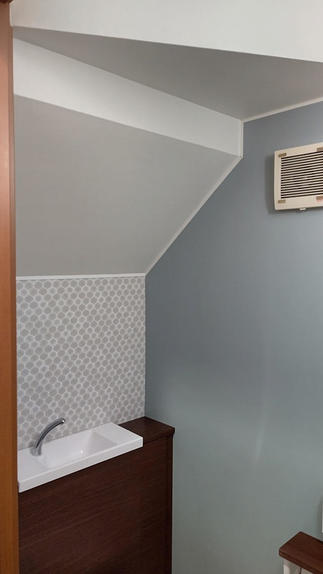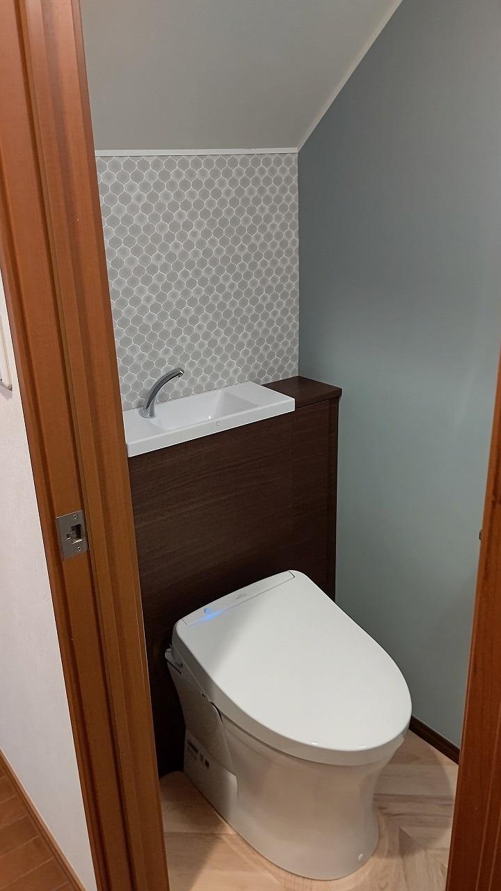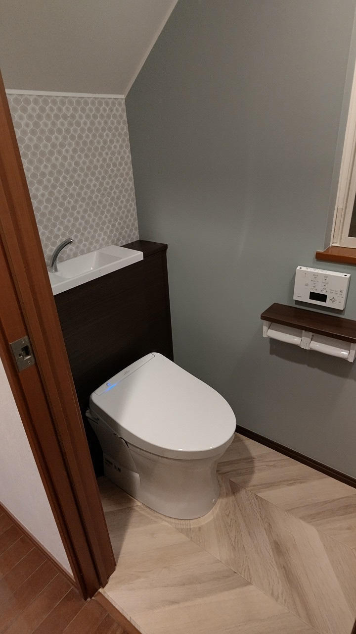 全体的にグレーで落ち着いたトイレになったと思います。ブルードミナントを意識して配色しました。ブルーグレー(ミントグリーングレー?)にヘリンボーン柄の床柄。可愛らしさを少しプラスする背面のアクセントクロス。S様の要望を無事に叶えられたかと自負しています。