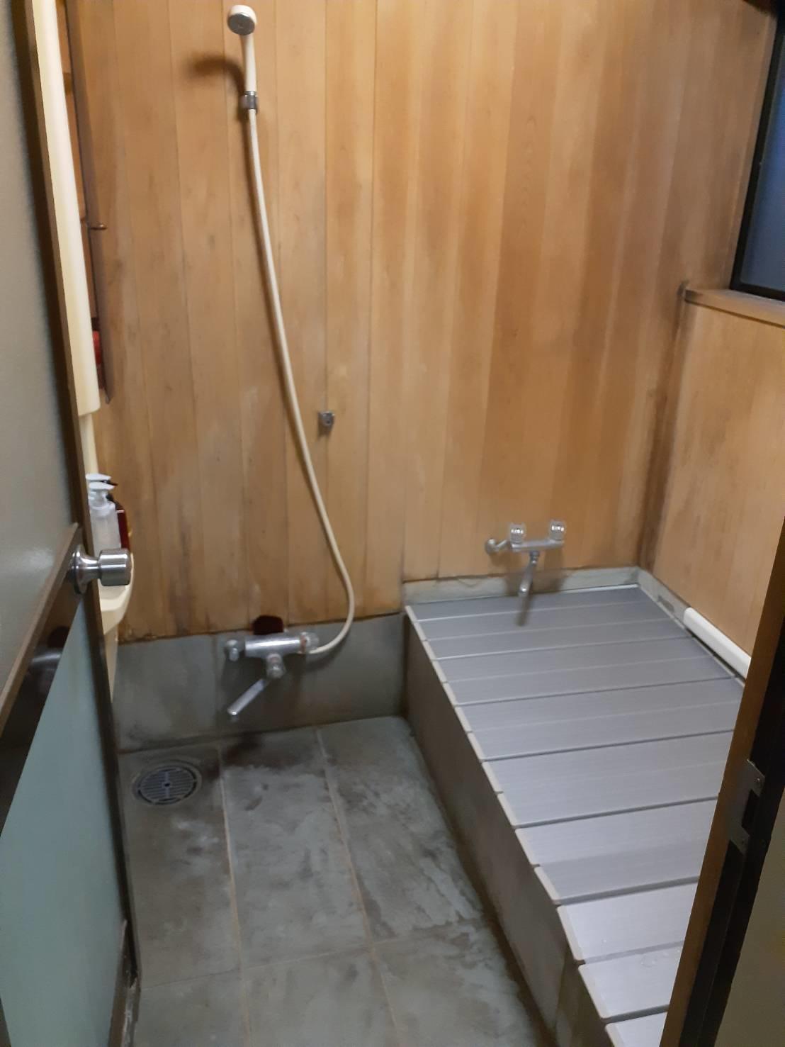 壁と天井が木で趣のある浴室でしたが、出入り口の段差が大きく、床が石で出来ているため、冬は冷たかったことでしょう。