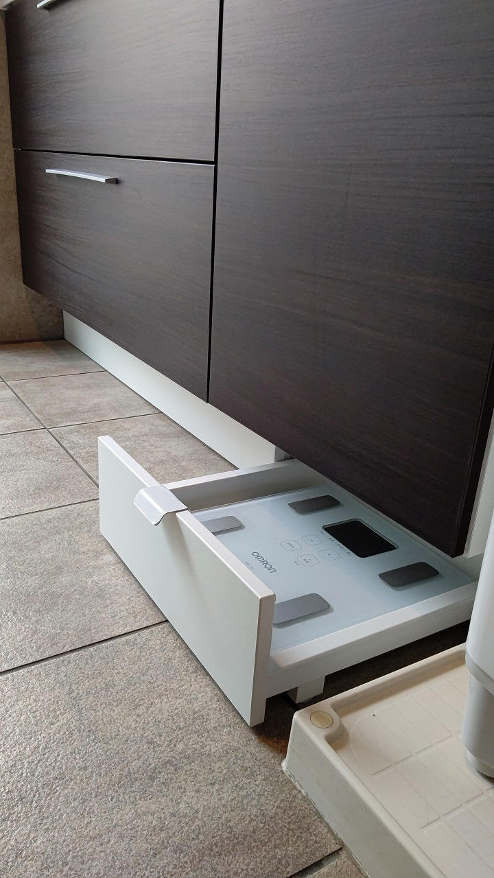上部吊戸は天高関係で規格では納まりません。特注製作で対応し納めました。当初のT社製では真ん中キャビネットが奥行き小さいものしかなく特注もきかなかったので諦めて、私の方で再作成しました。