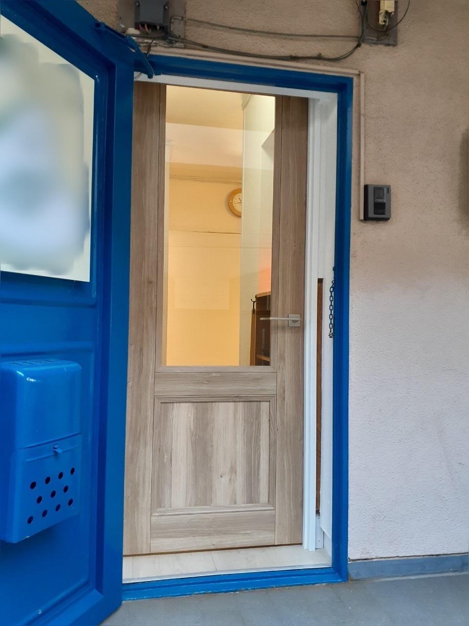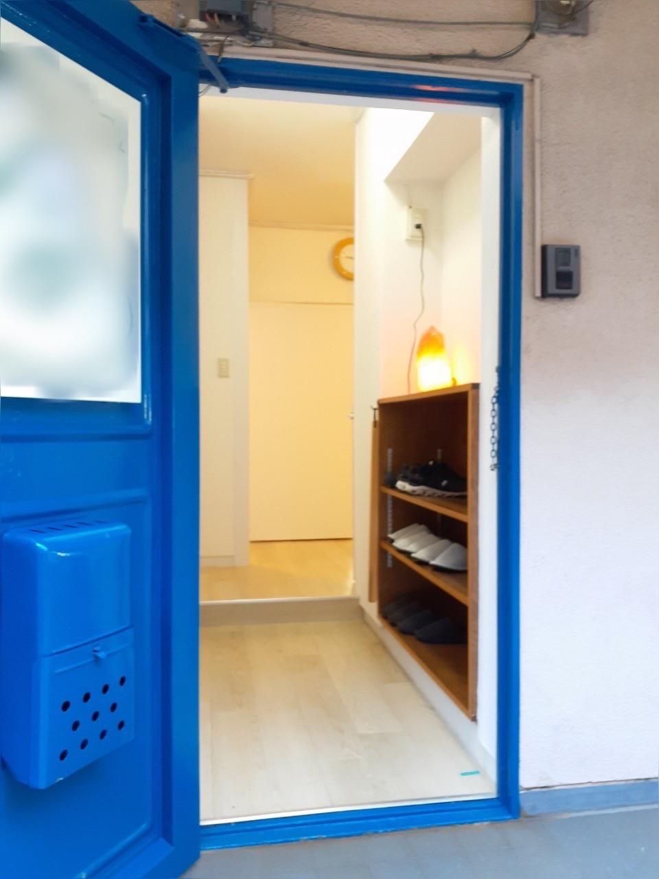 N様はマンションの一室を店舗として使用されていて、玄関の鉄扉を開けておきたいけど扉は欲しい、、ということで、玄関扉の内側に室内ドアを設置させていただきました。